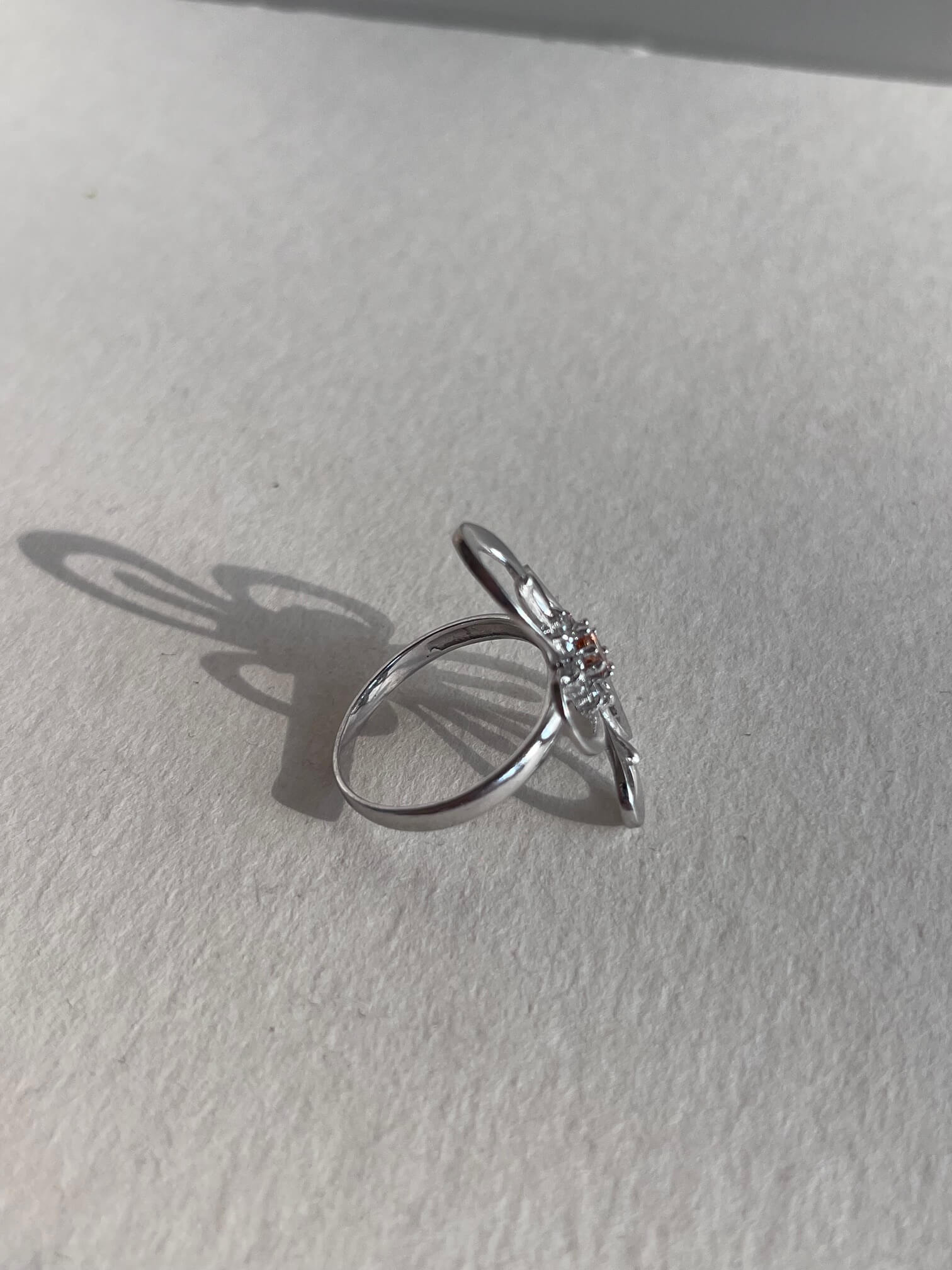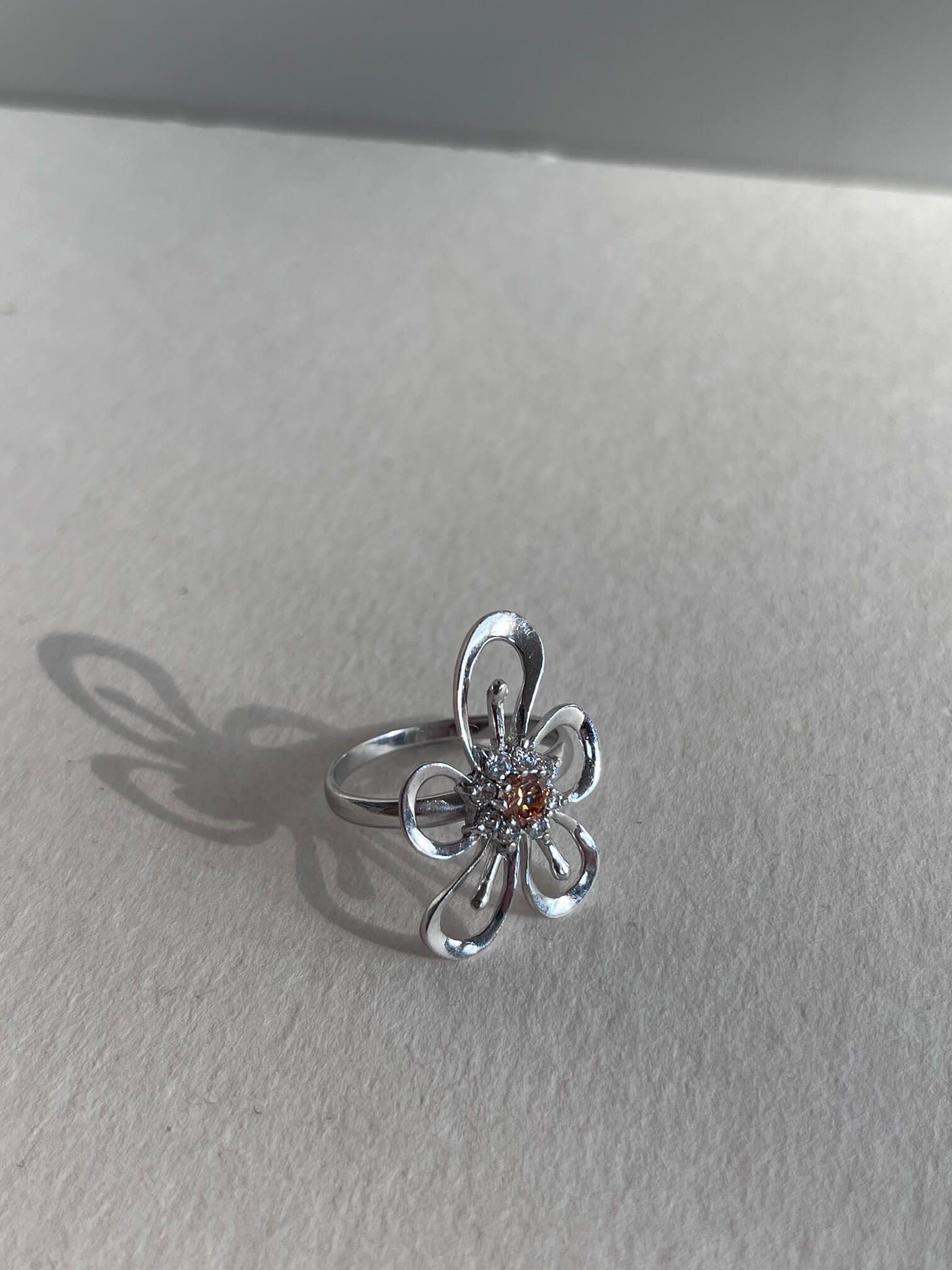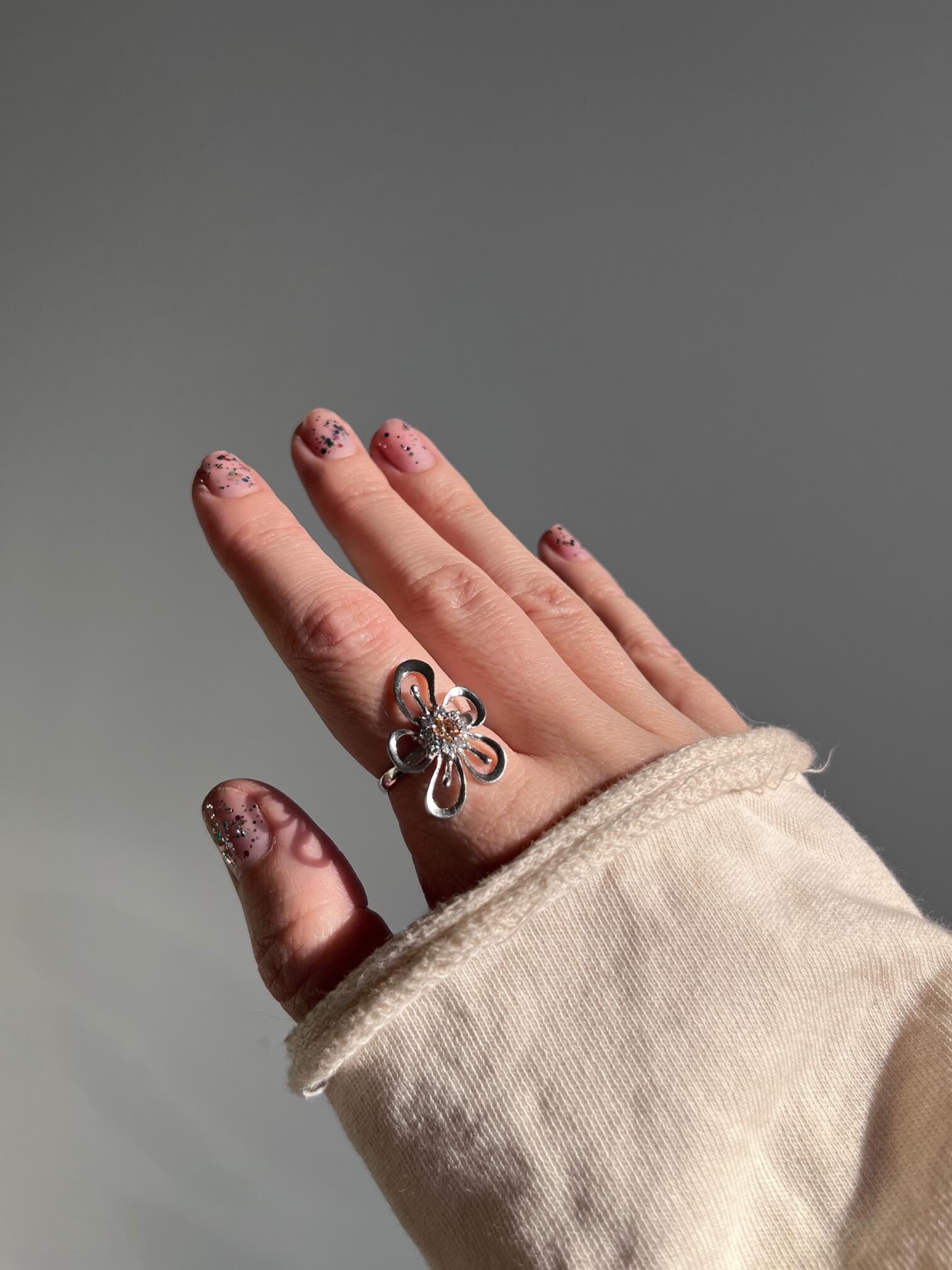 Srebrny pierścionek w formie kwiatu z cyrkoniami. Bardzo spektakularnie wygląda.