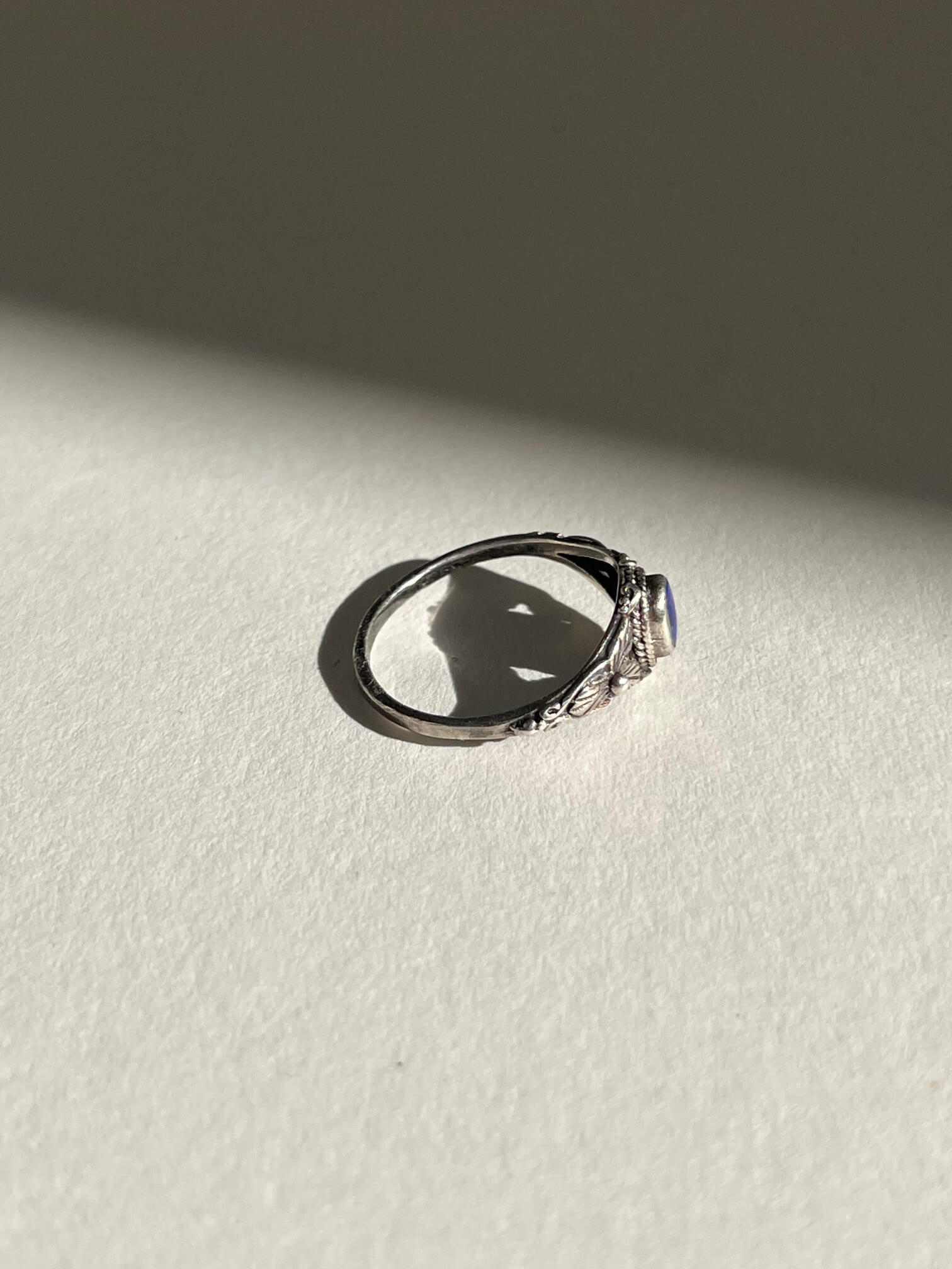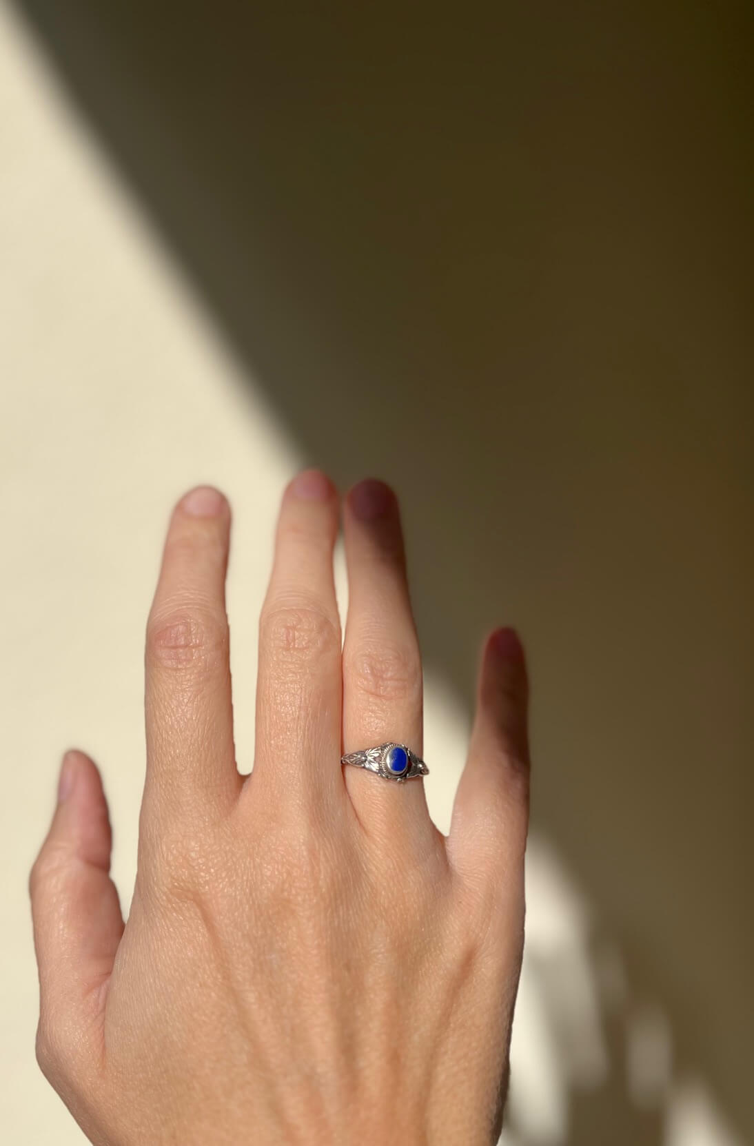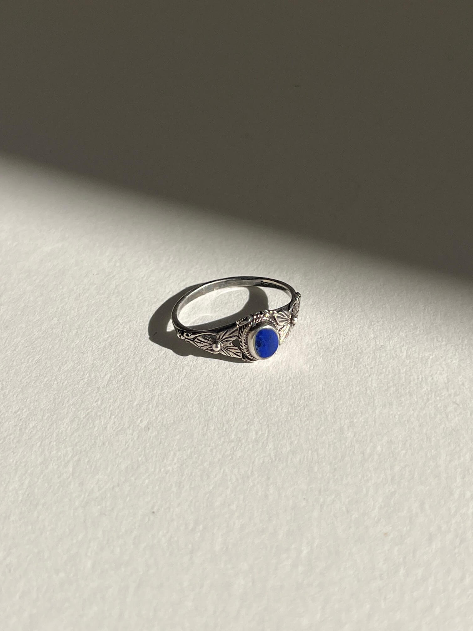 Stary, srebrny pierścionek z floralnymi lementami i naturalnym lapisem.