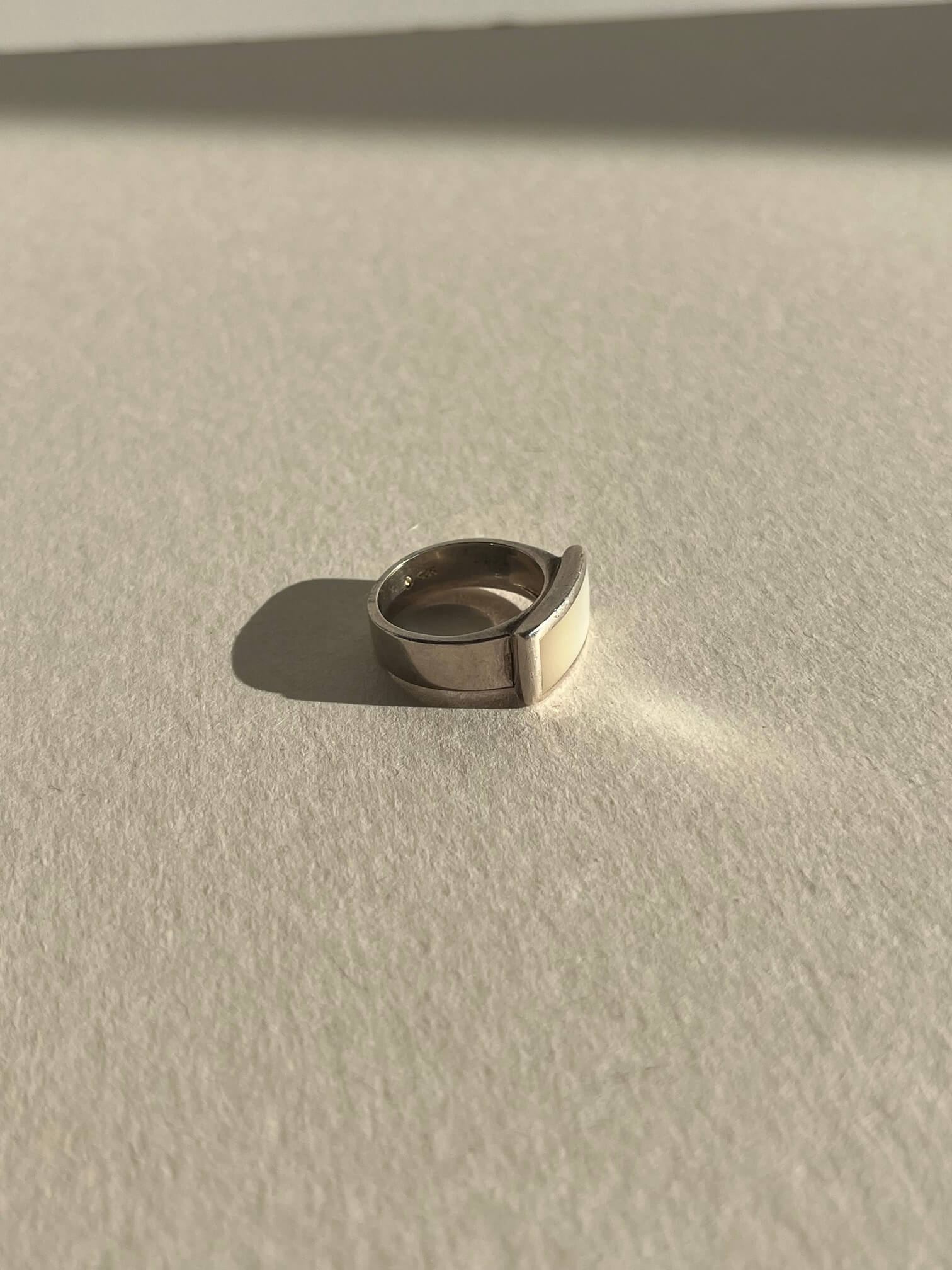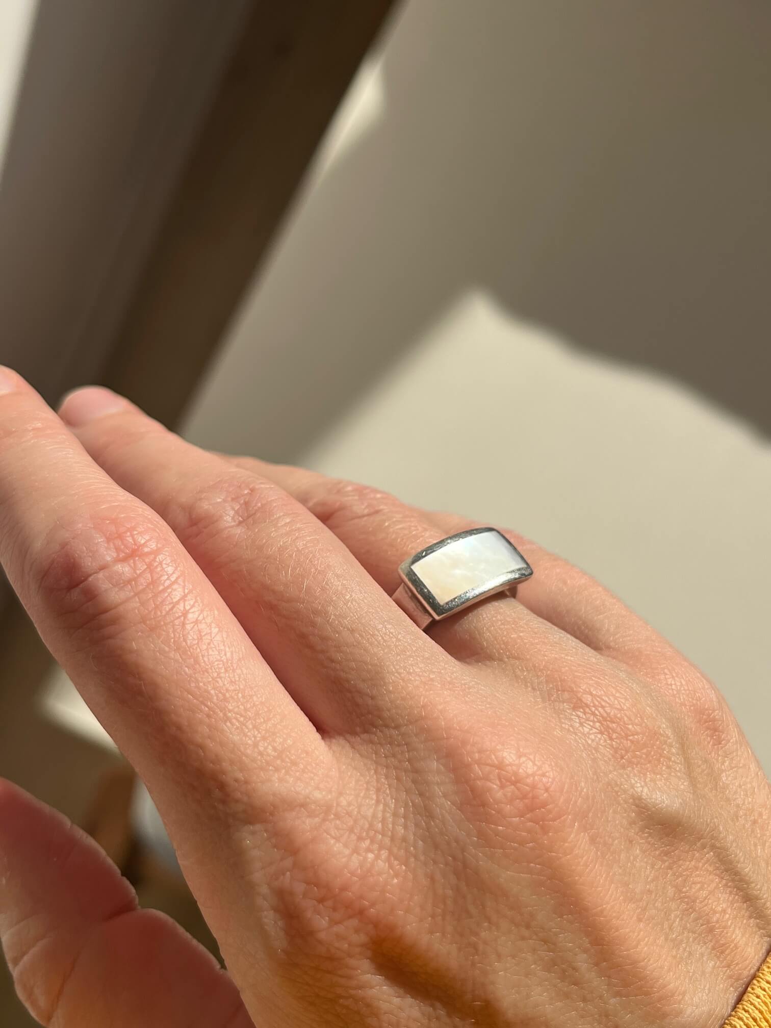 Pierścionek z prostokątną masą perłową oprawioną w srebro. PIęknie odbija światło.