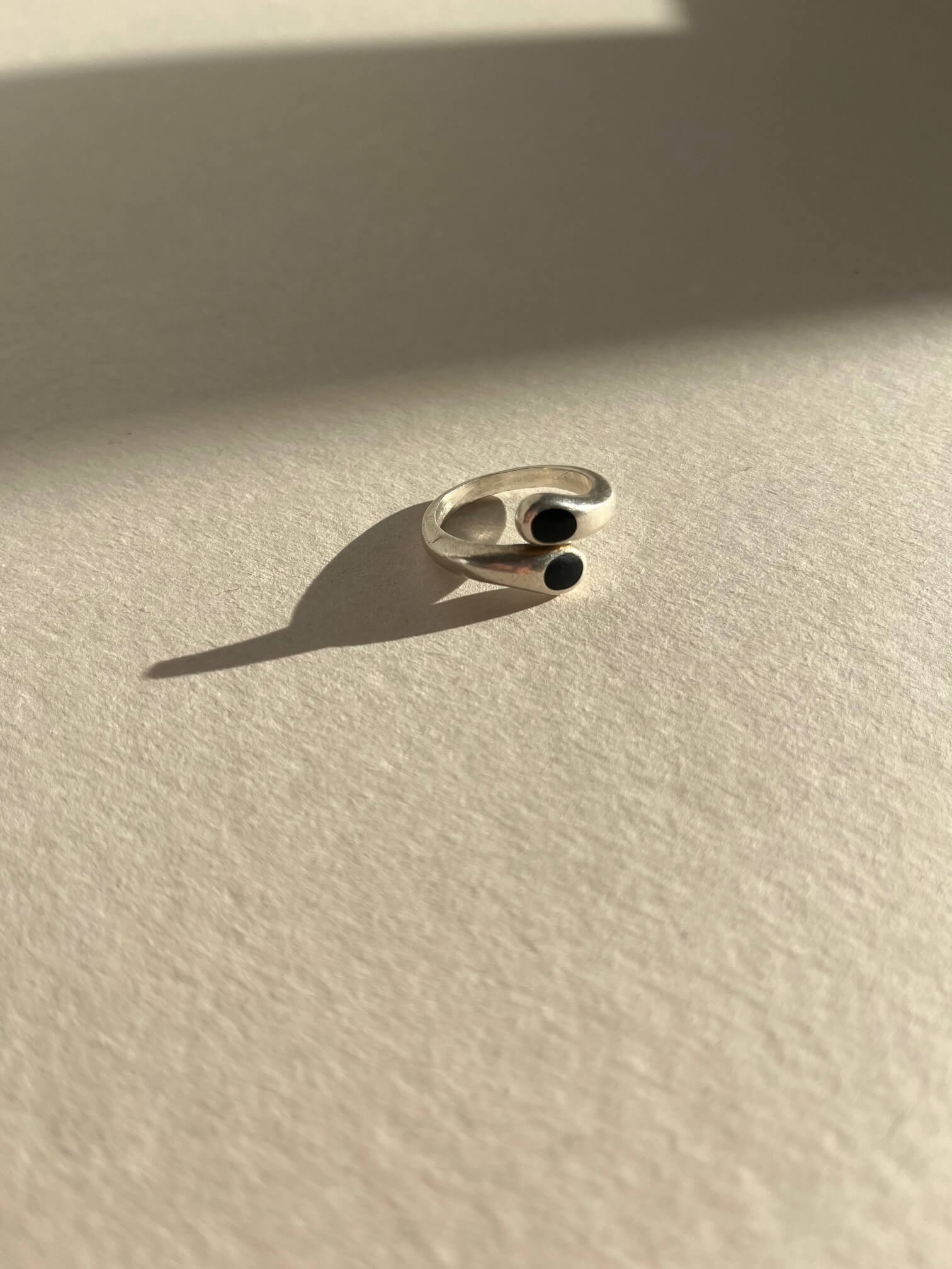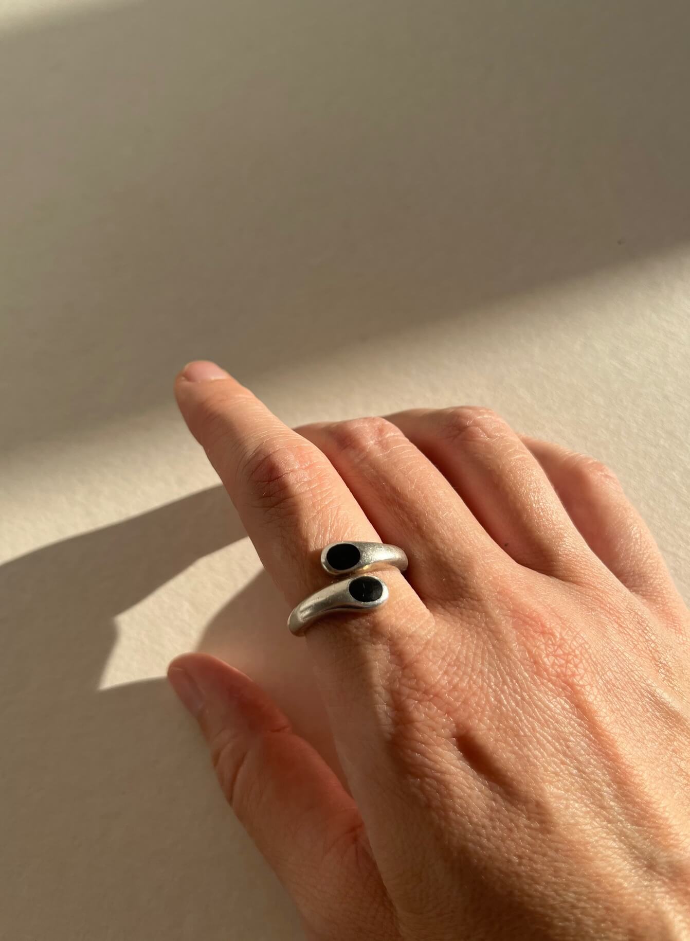 Srebrny pierścionek z 2 onyksami. Obwód jest otwarty i można swobodnie dopasować rozmiar. Najlepiej będzie się prezentował na rozmiarach 11-18.