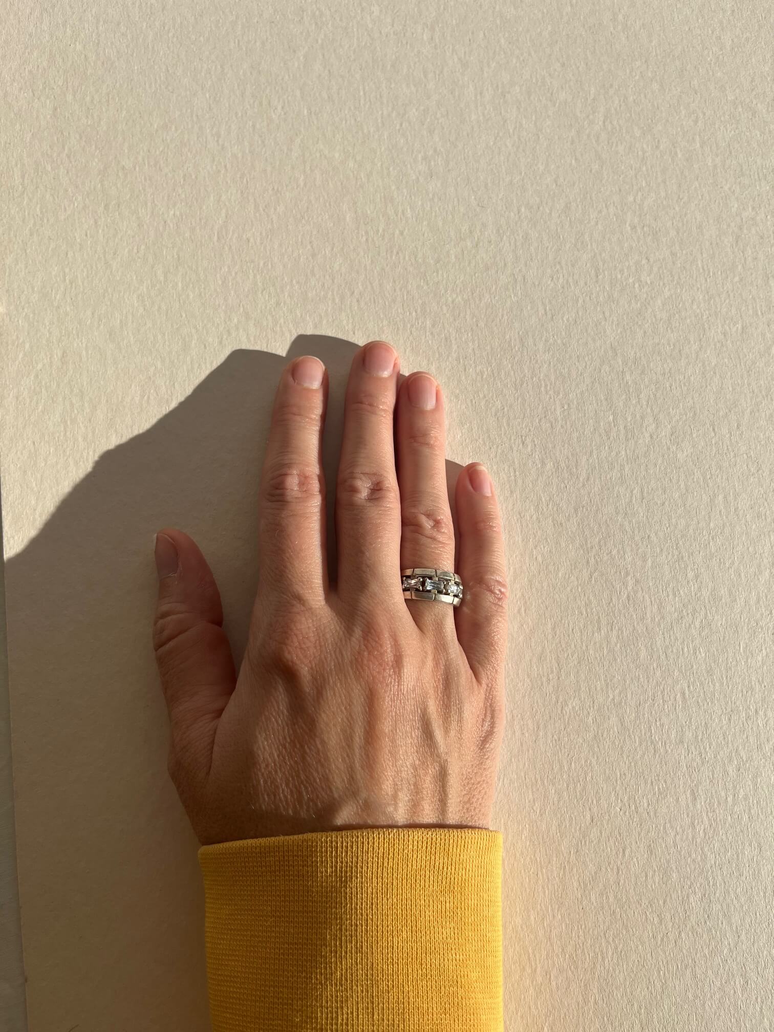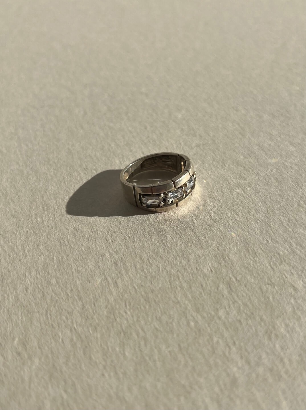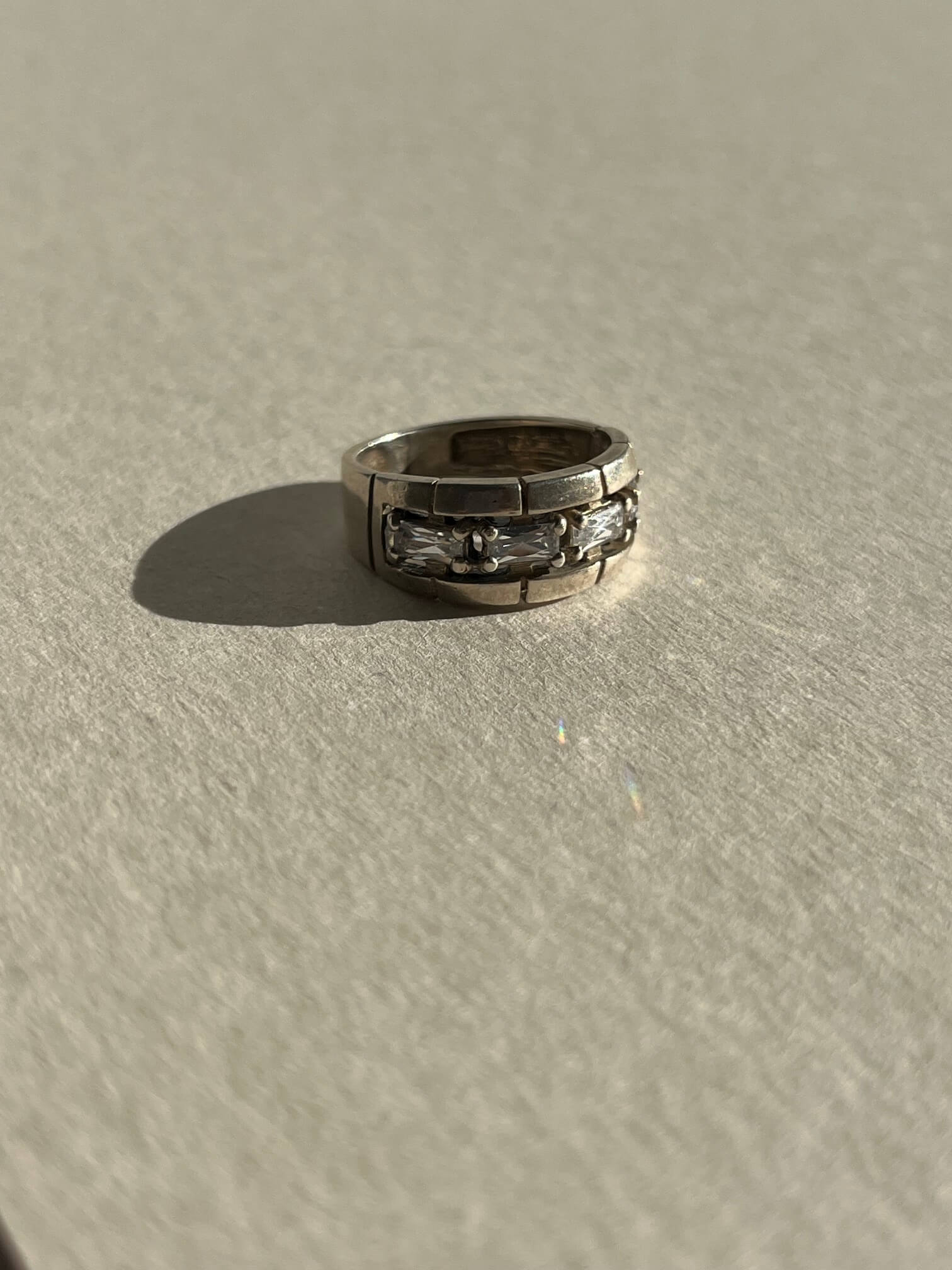 Srebrny pierścionek z podłużnymi kamieniami ( najprawdopodobniej cyrkonie).