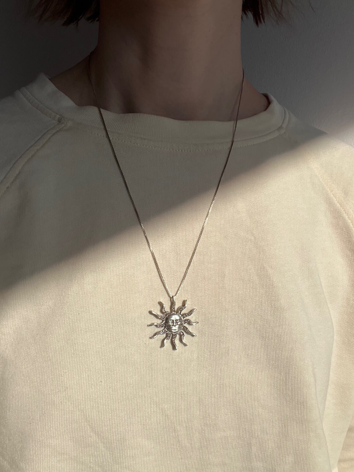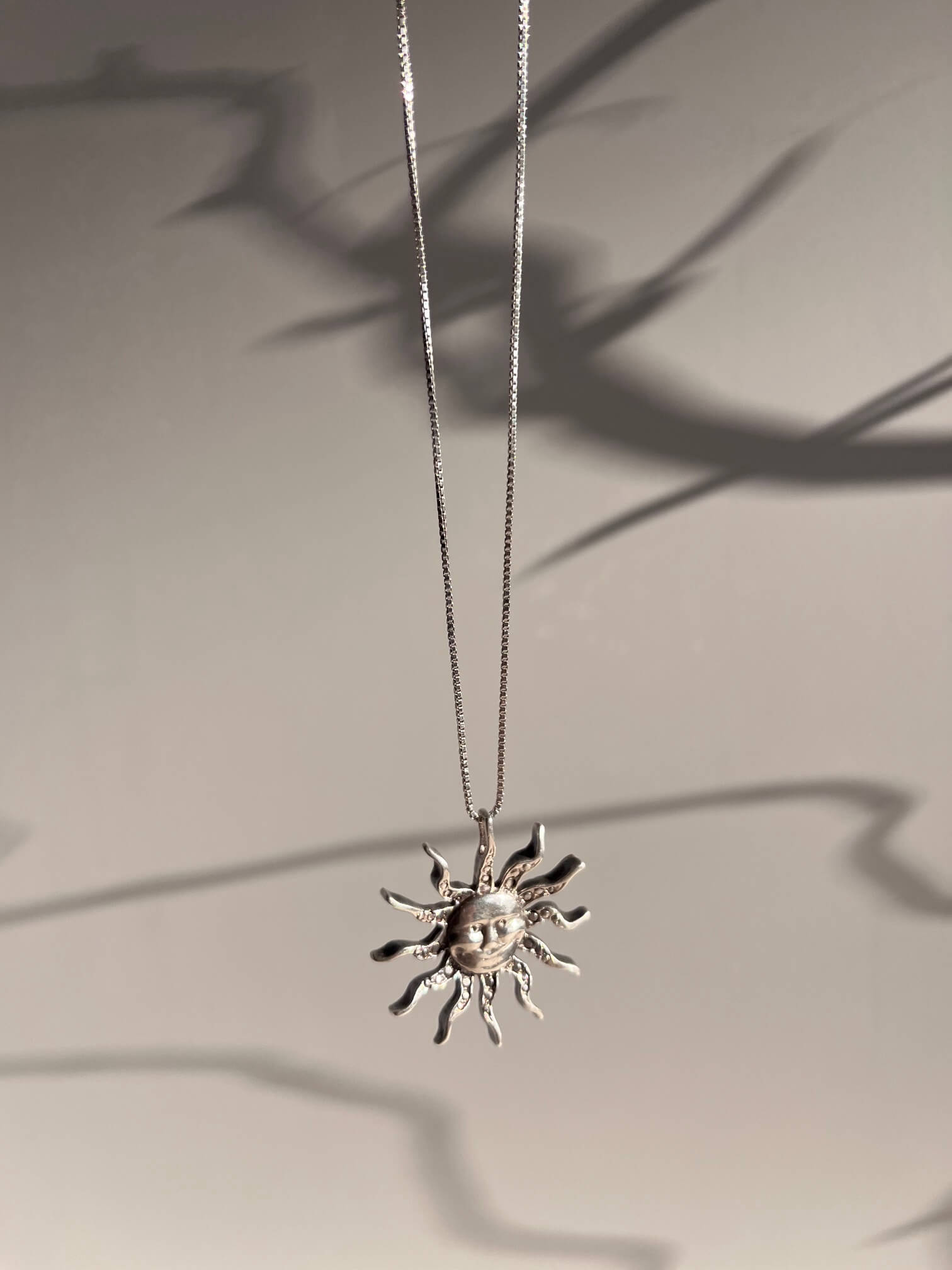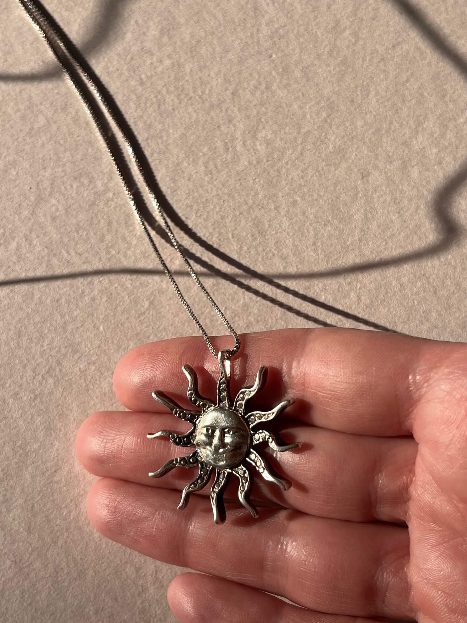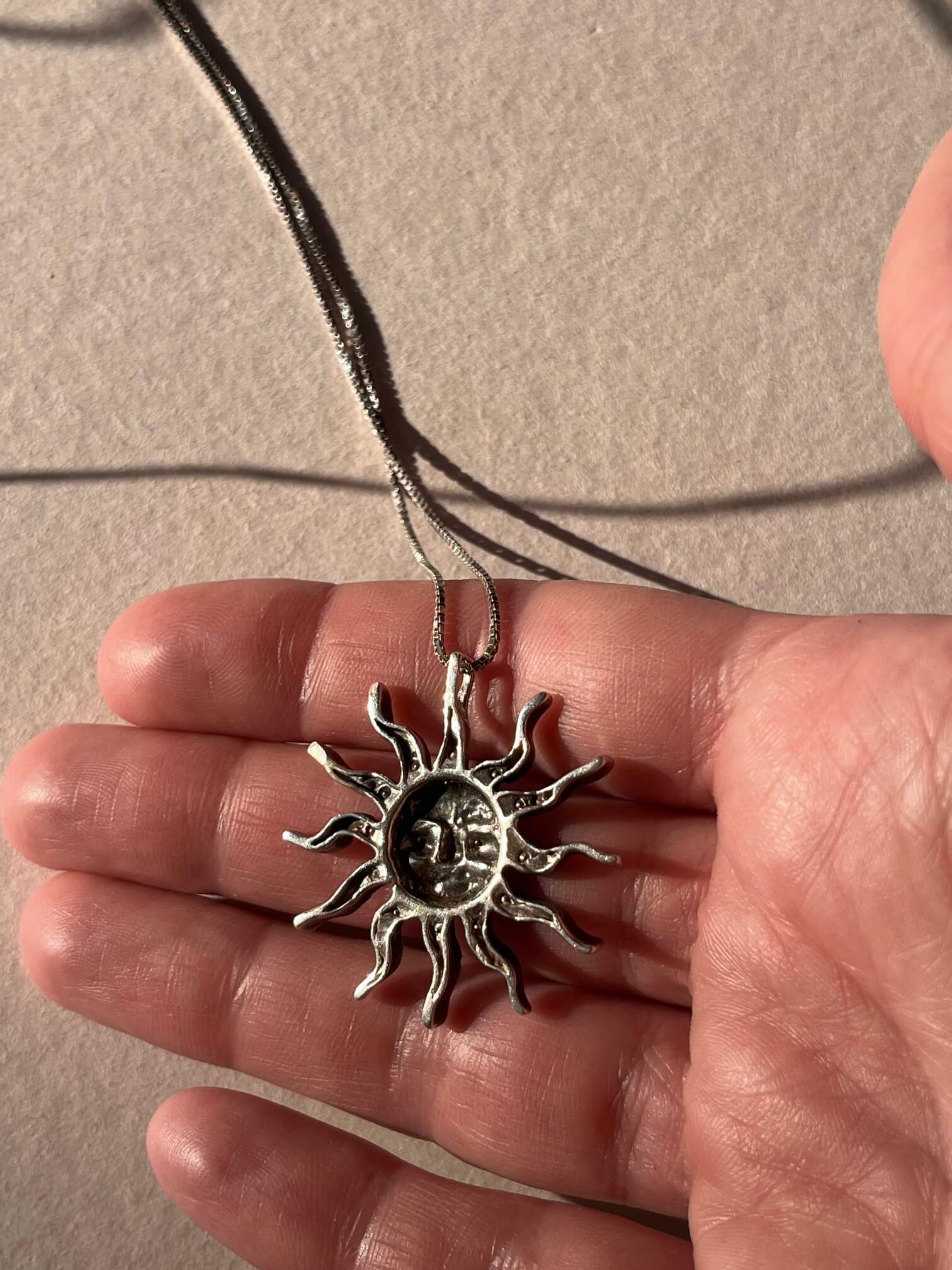 Śrebrny naszyjnik z piękną zawieszką w słońca. Obwód łańcuszka 55cm. Długość zawieszki 3,2cm.