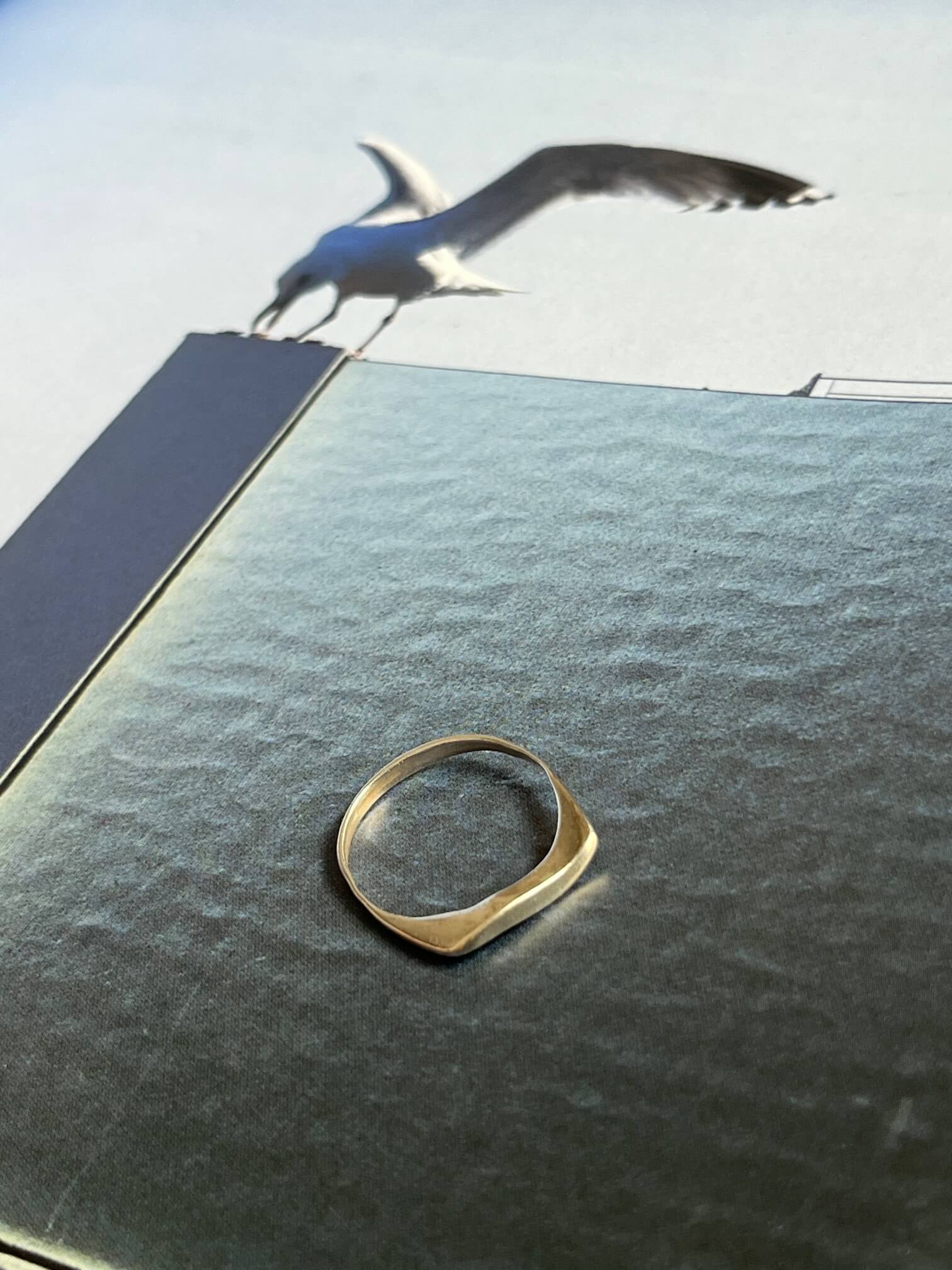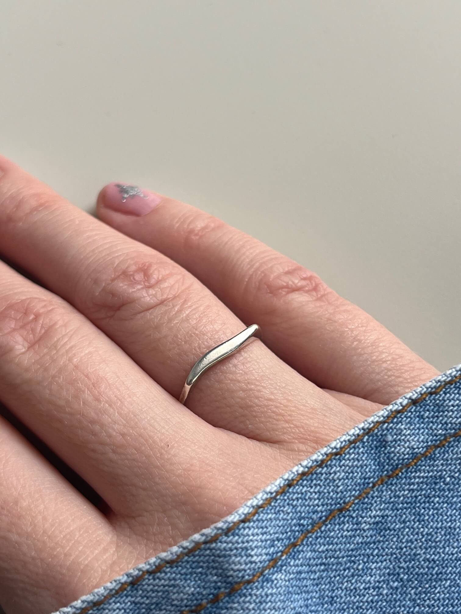 Srebrny pierścionek o dalikatnej formie, przypominający fale.