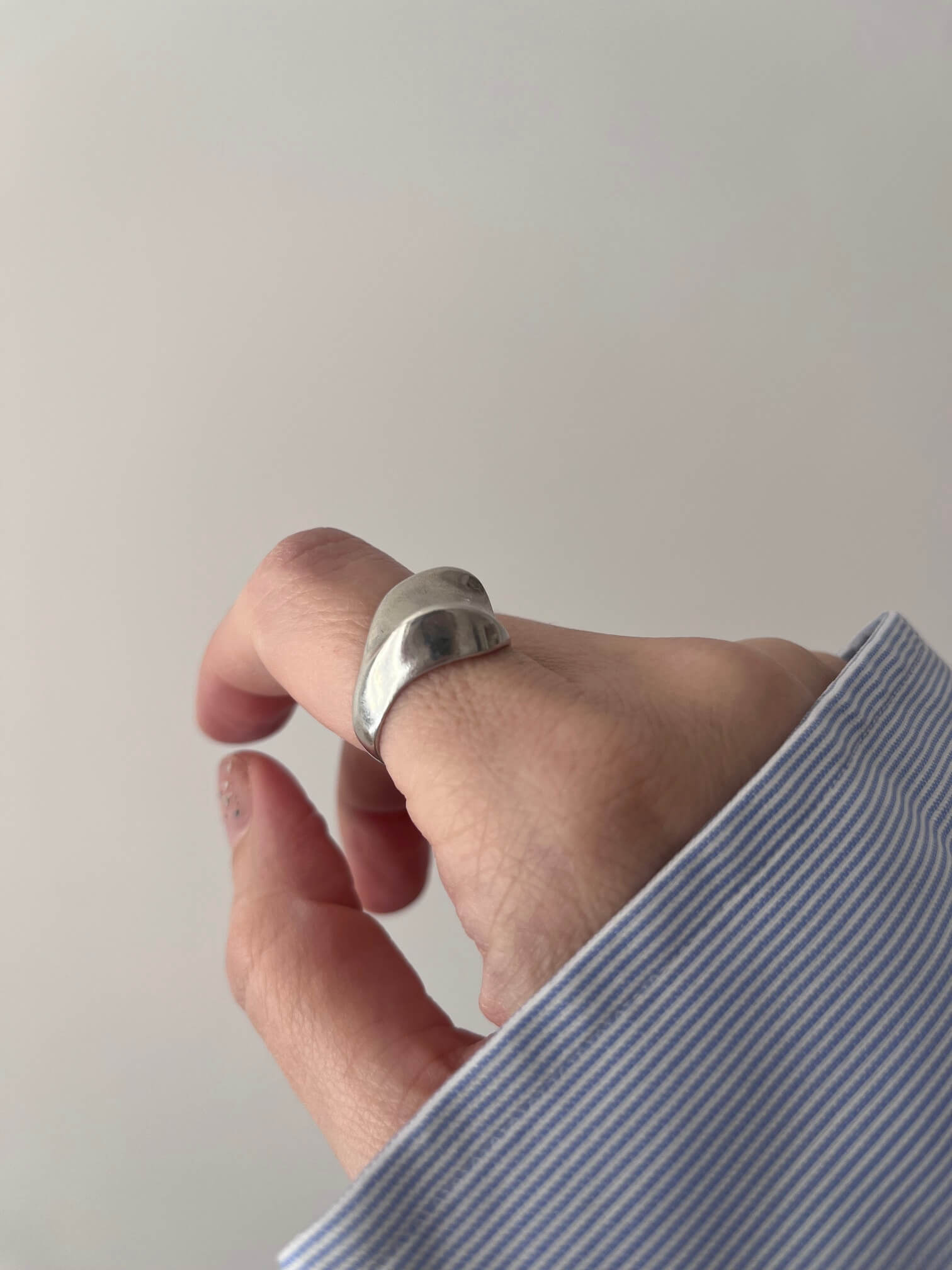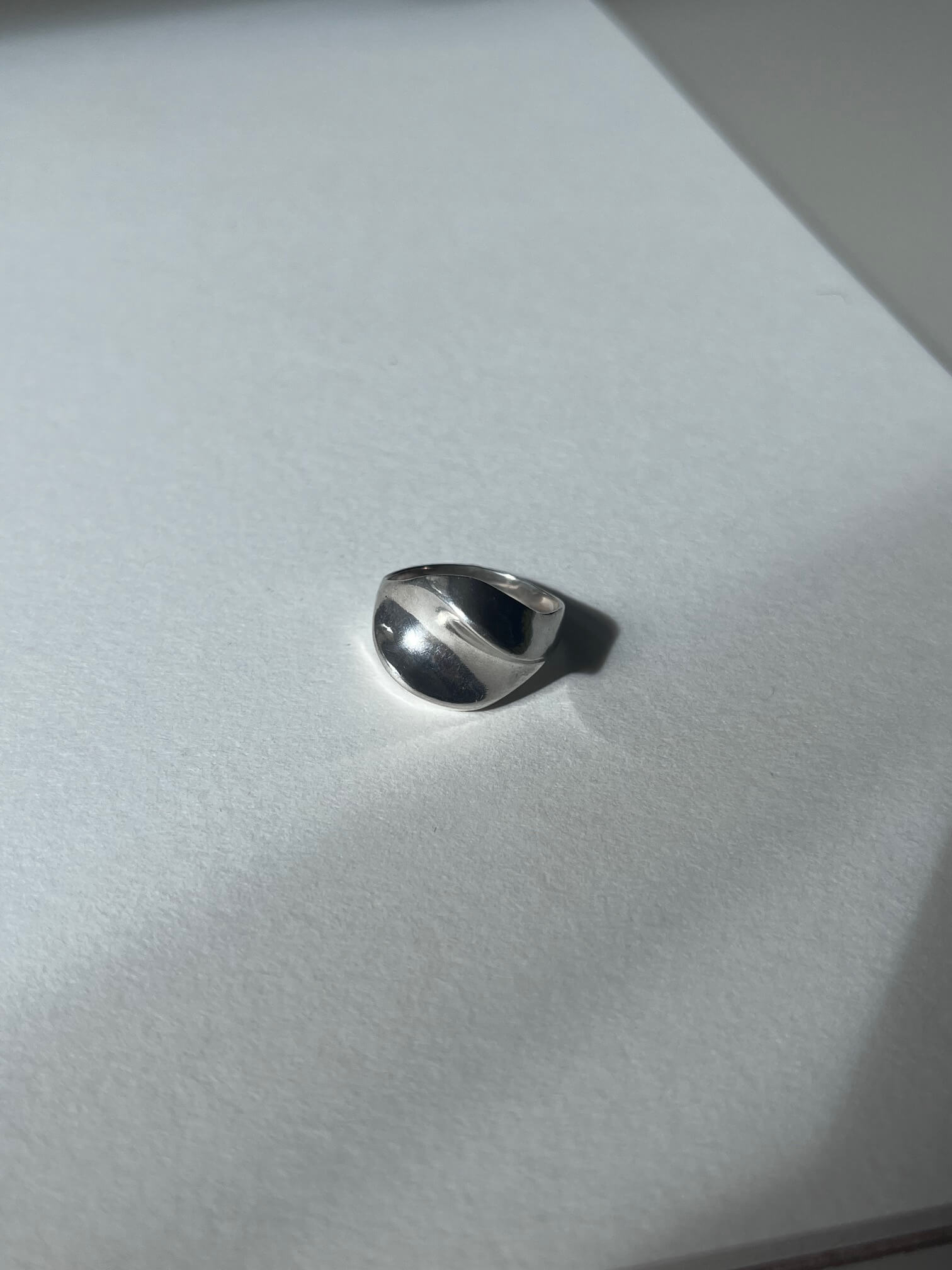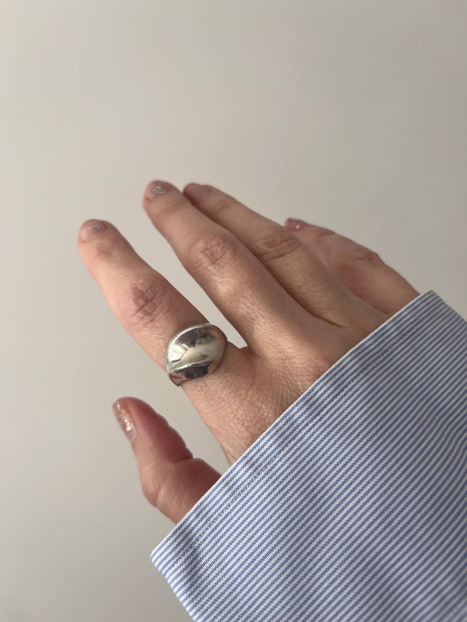 Srebrny pierścionek o botanicznej formie, pięknie odbija światło.
