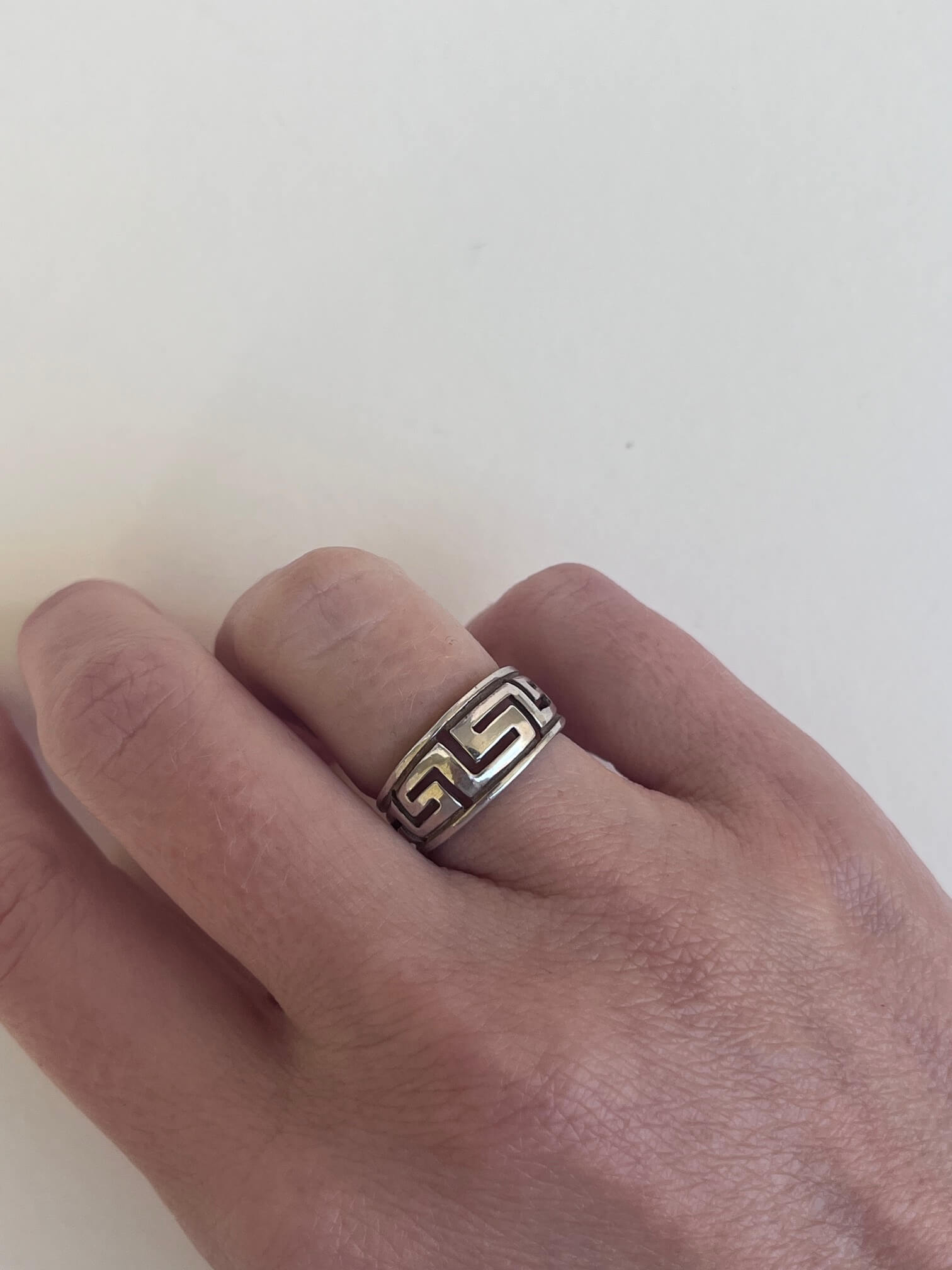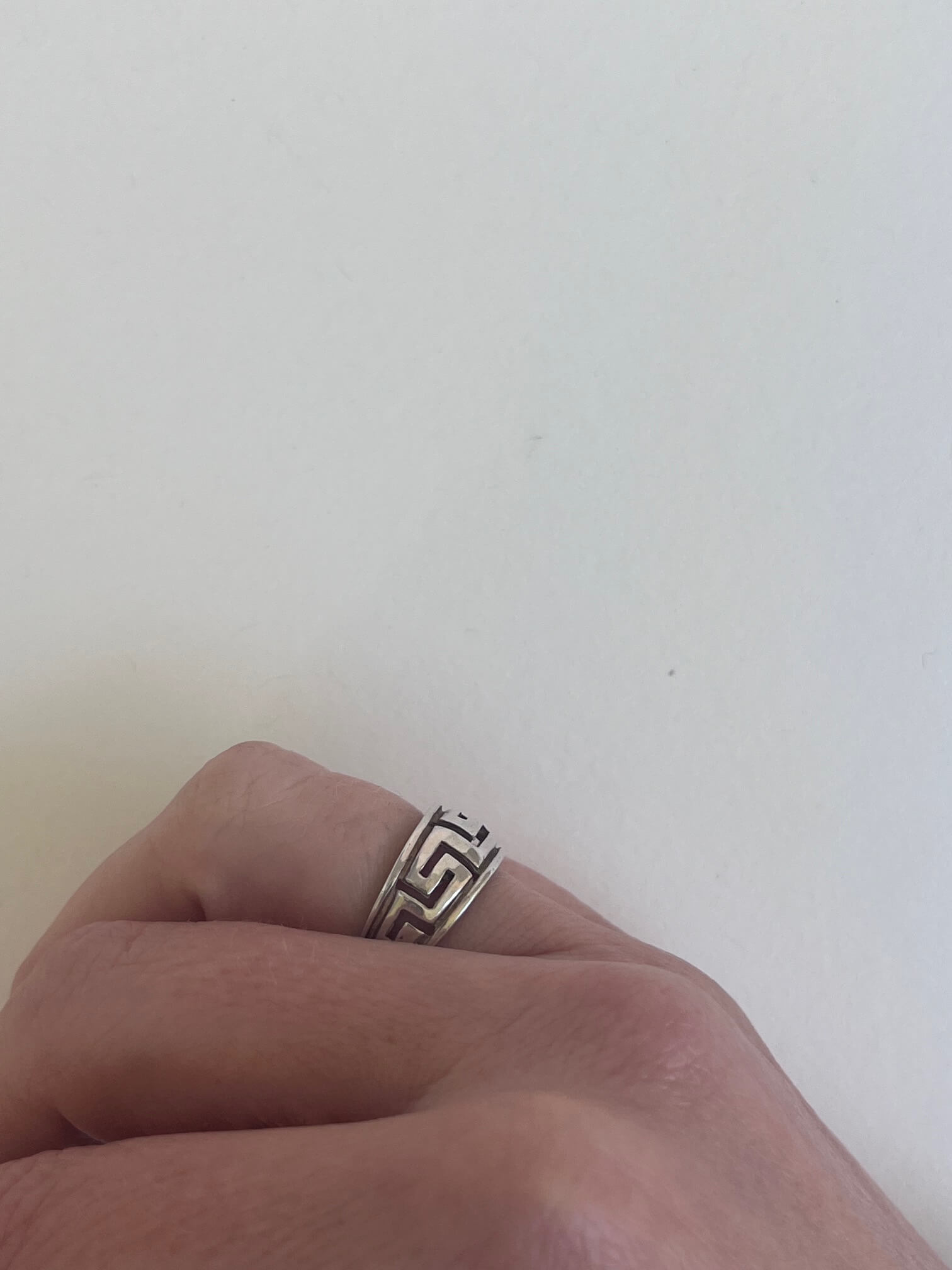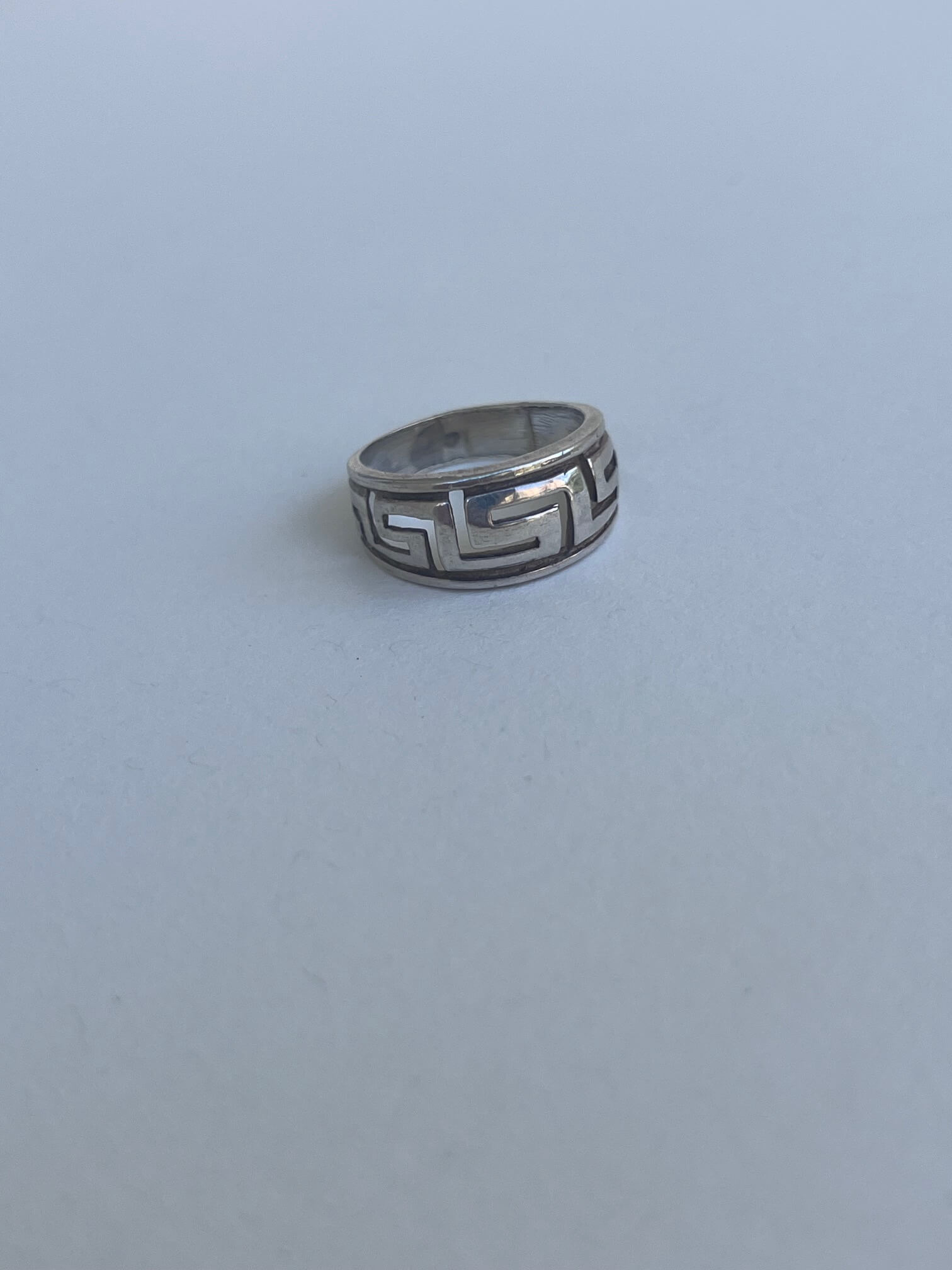 Srebrny pierścionek o prostej formie z charakterystycznymi greckimi wzorami.