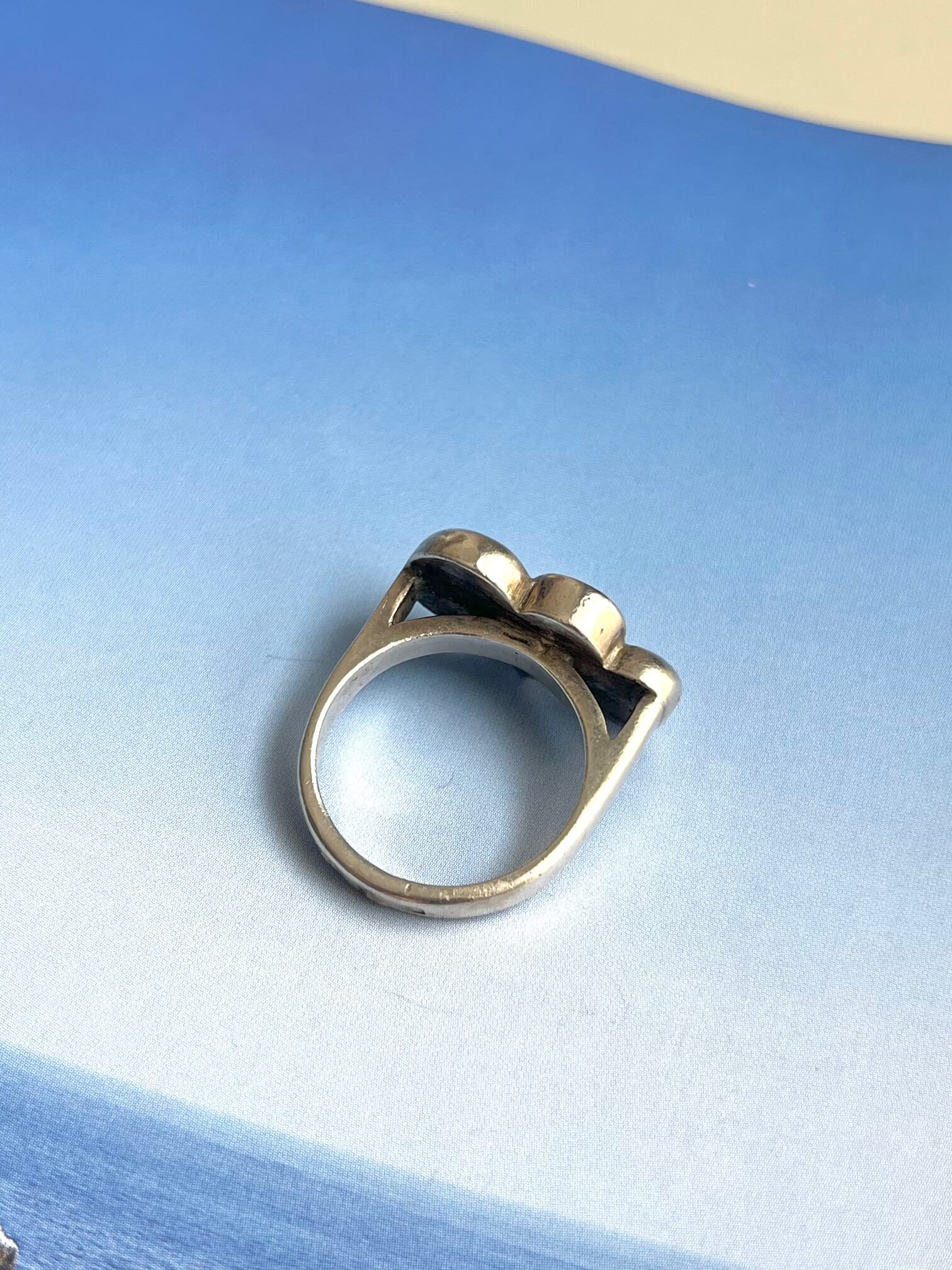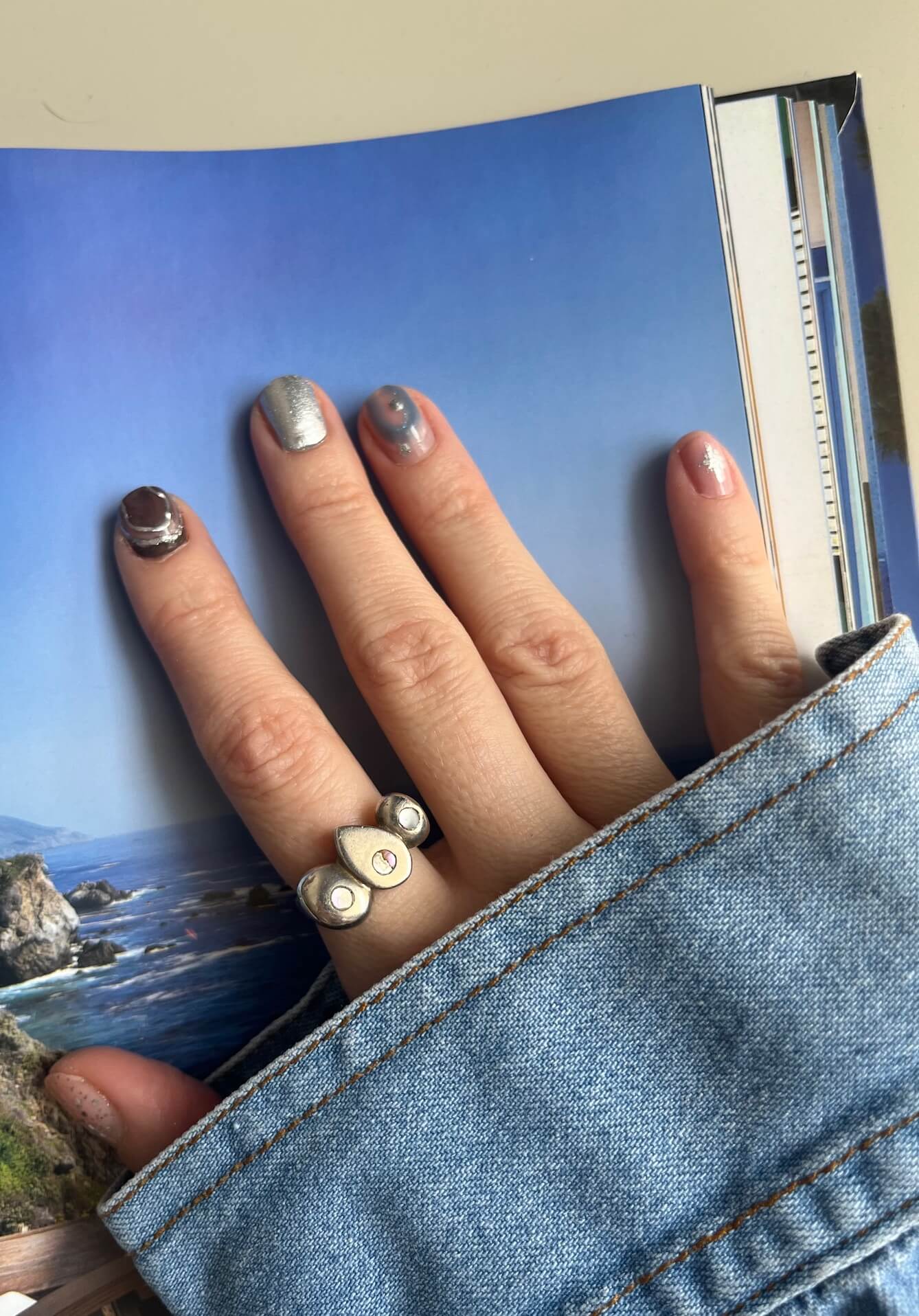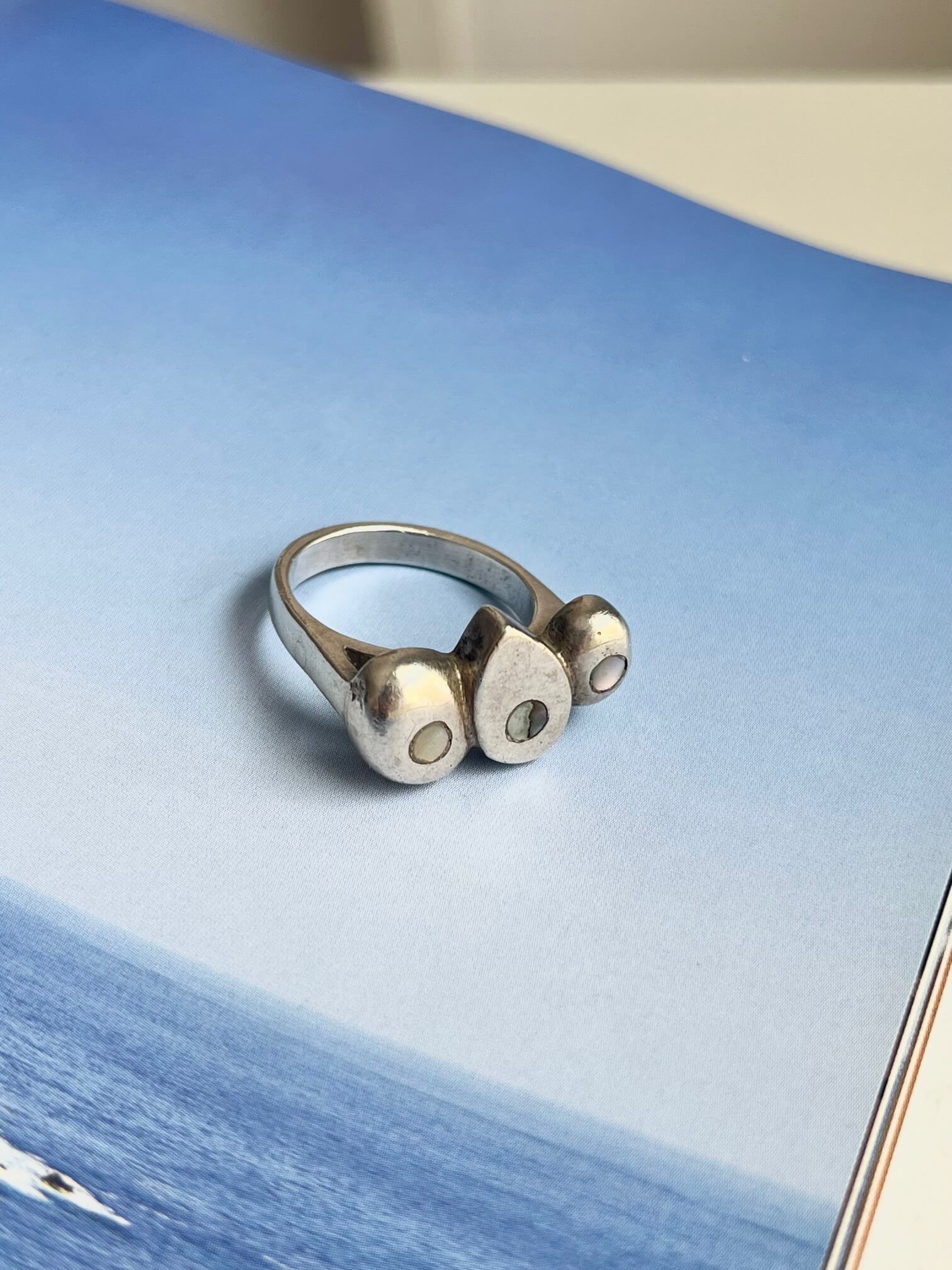 Srebrny pierścionek o formie sygnetu. W 3 kroplach zatopione są okrągłe muszle. które pięknie odbijają światło.