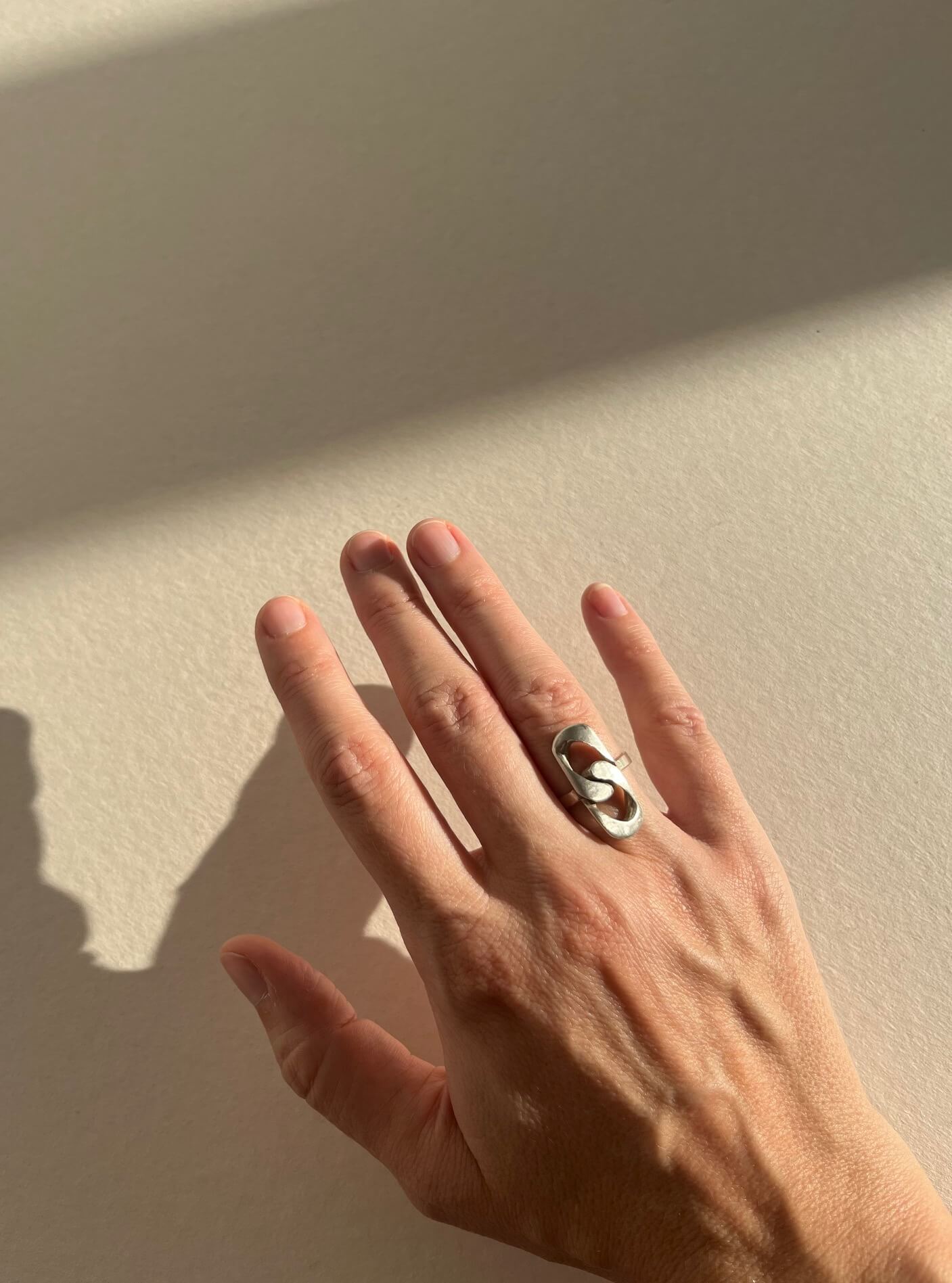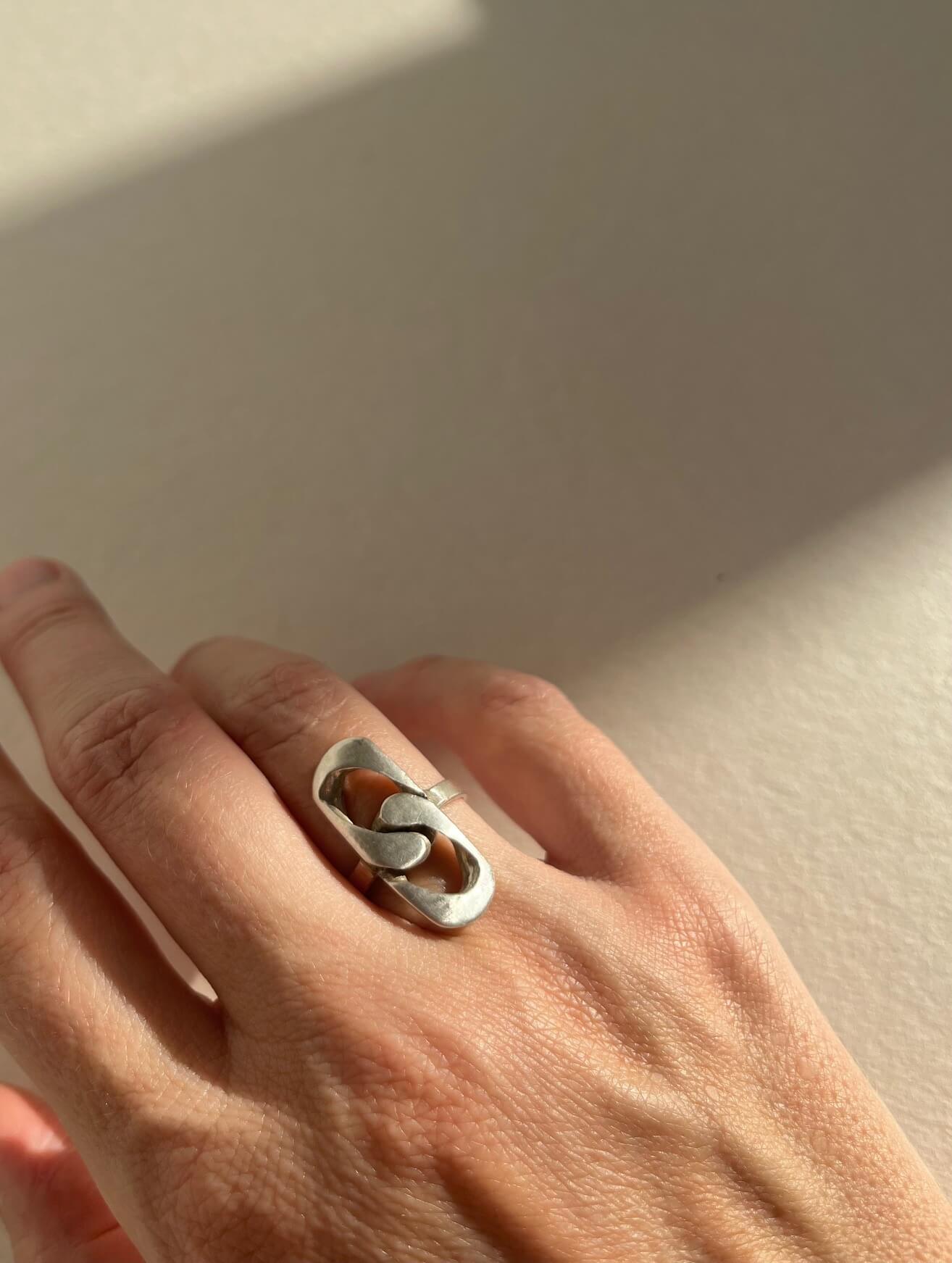 Srebrny pierścionek z elementami ogniwek łańcucha.