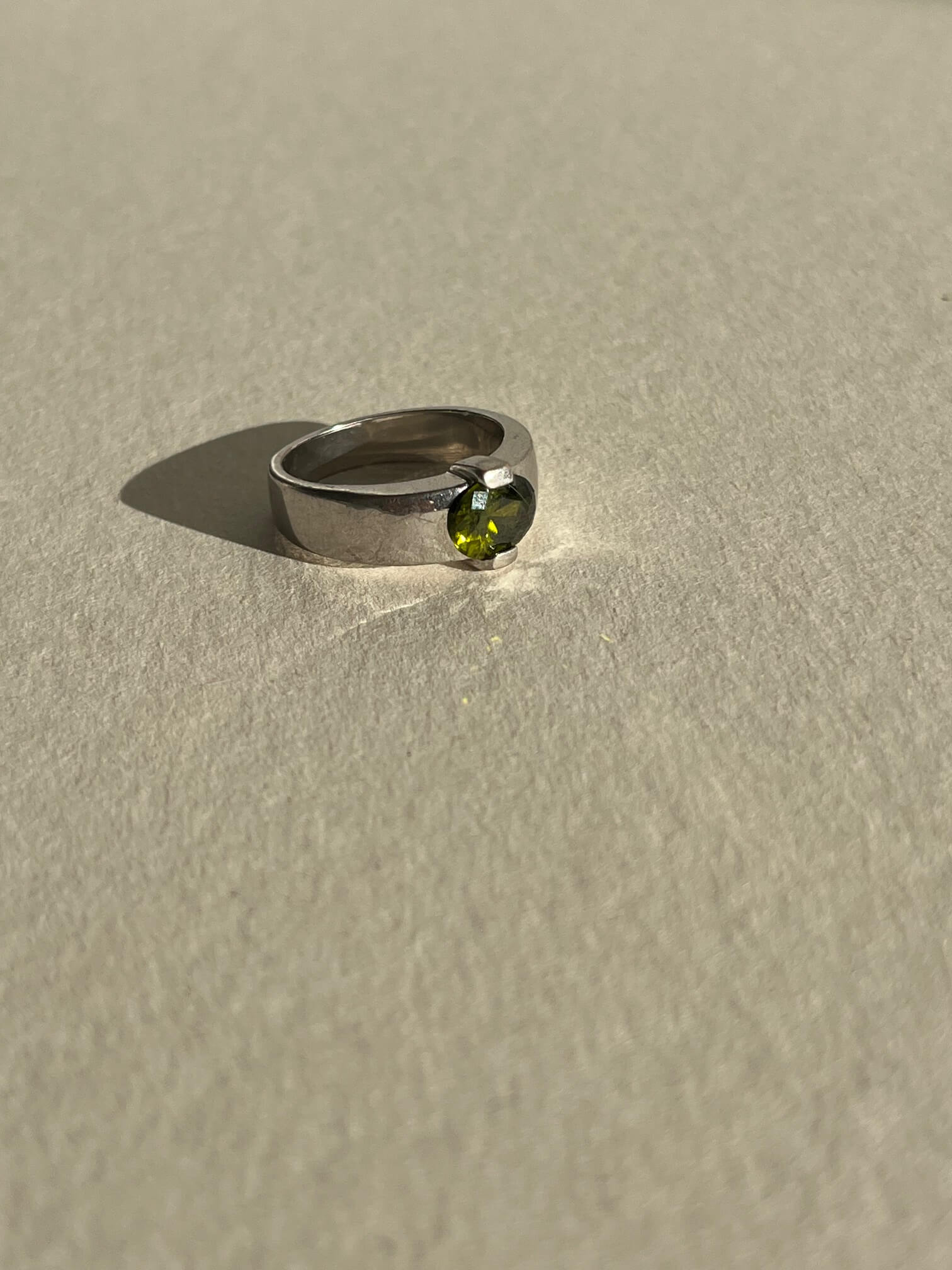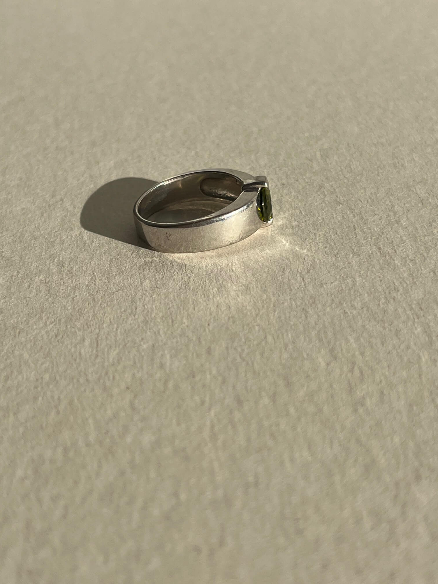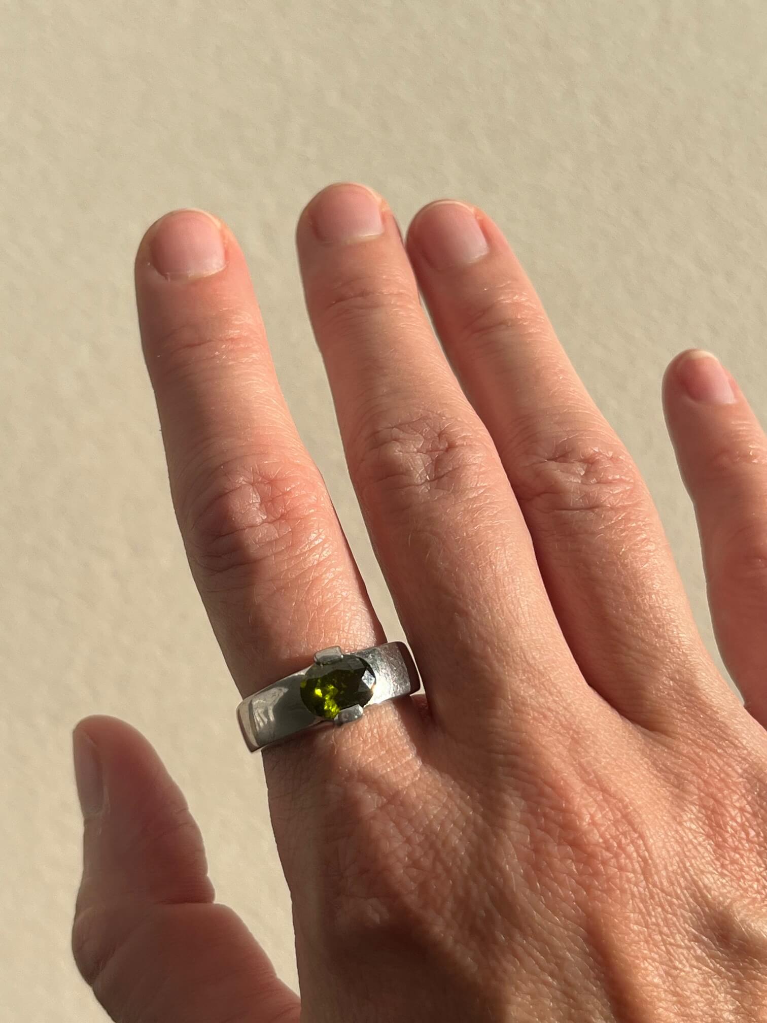 Pierścionek ze srebra z owalnym szlifowanym kamieniem (prawdopodobnie jest to cyrkonia, ale kolor ma piękny jak perydot).