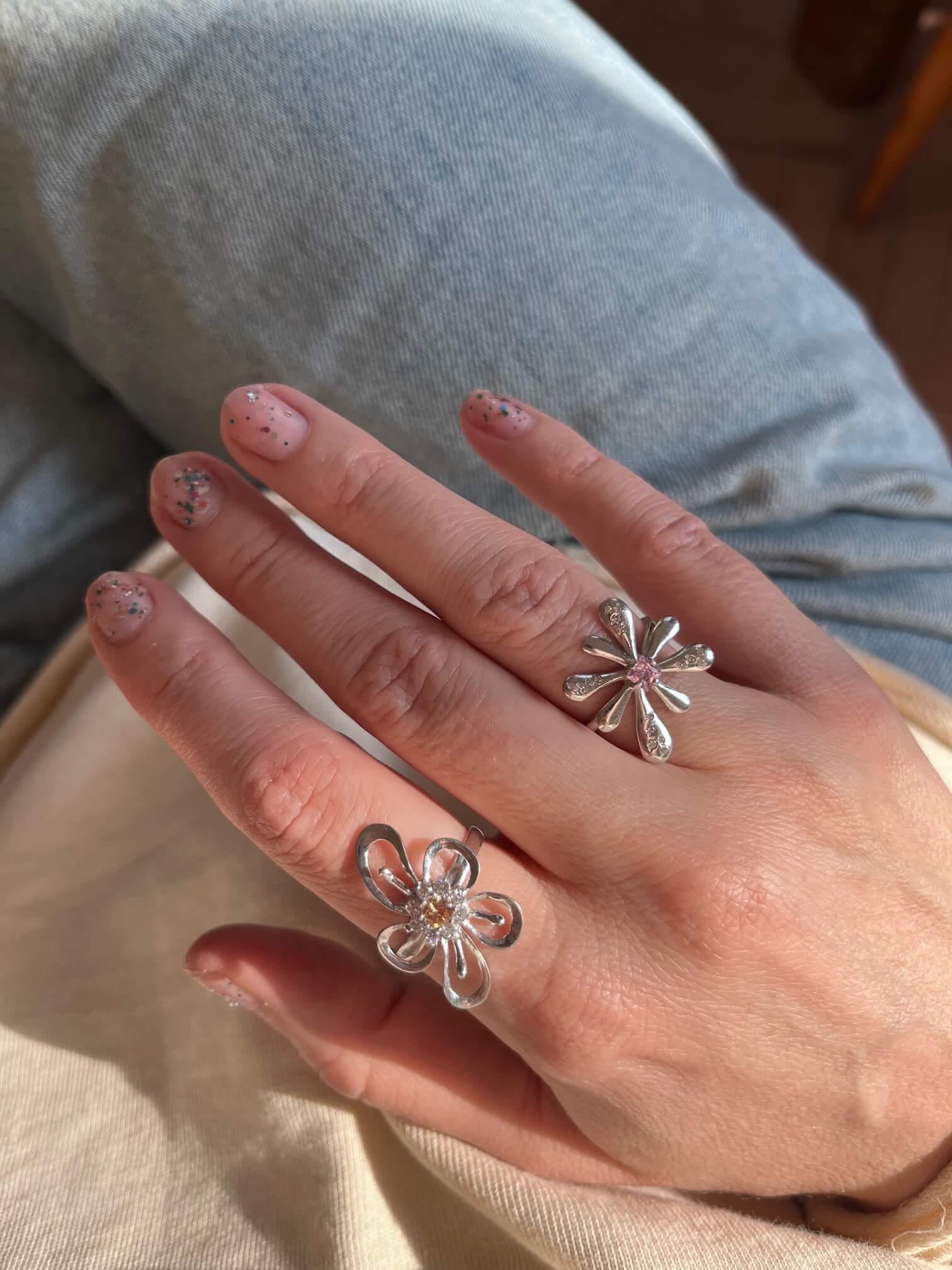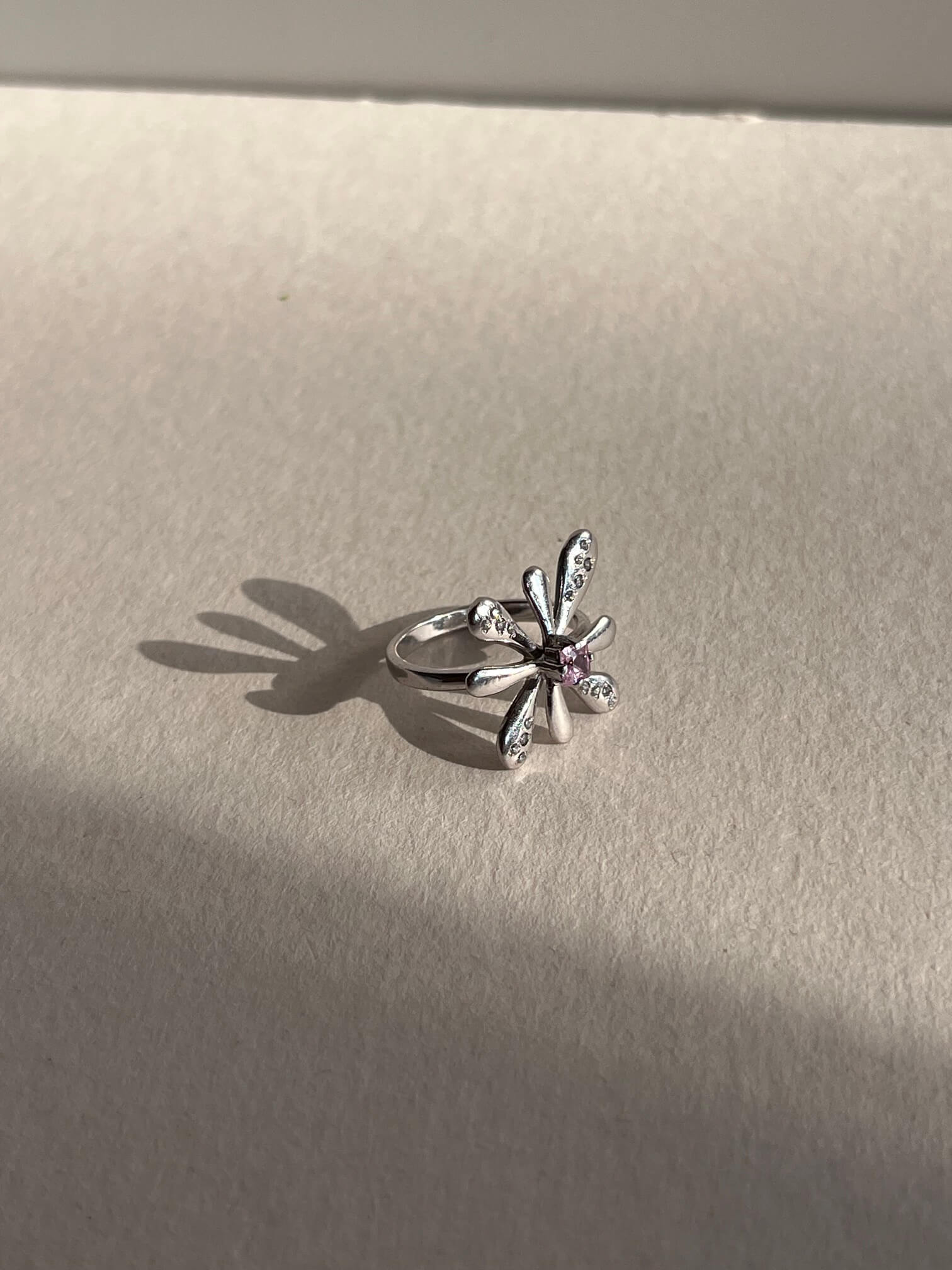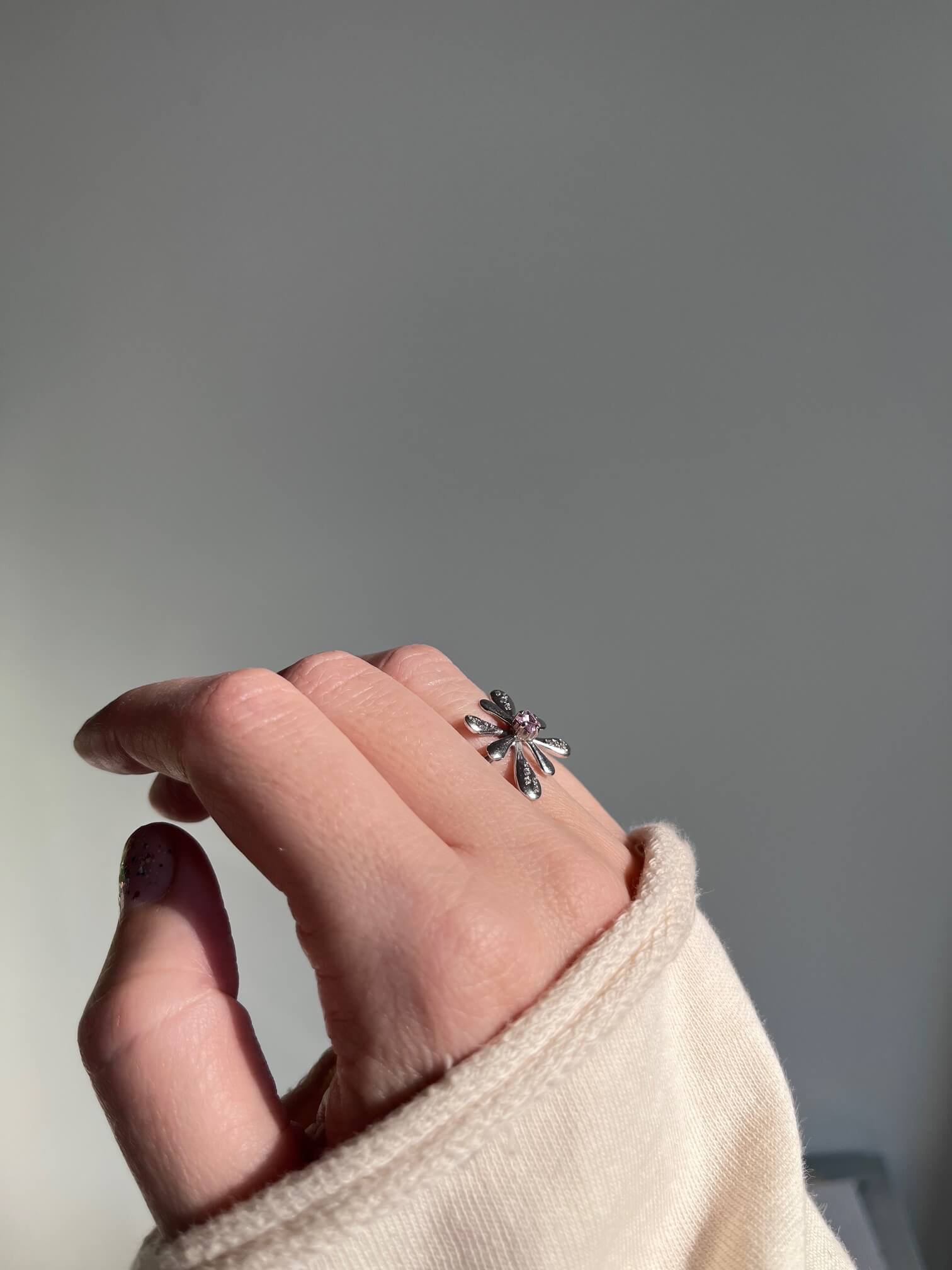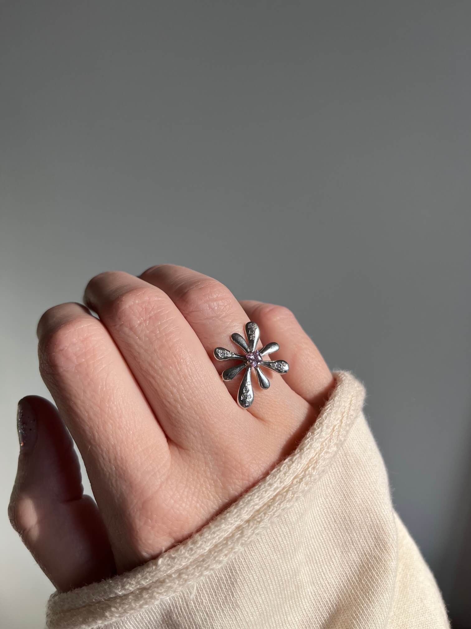 Srebrny pierścionek, kwiat. W centrum różowy kamień i kilka drobnych kryształków na płatkach. Super wiosenny.