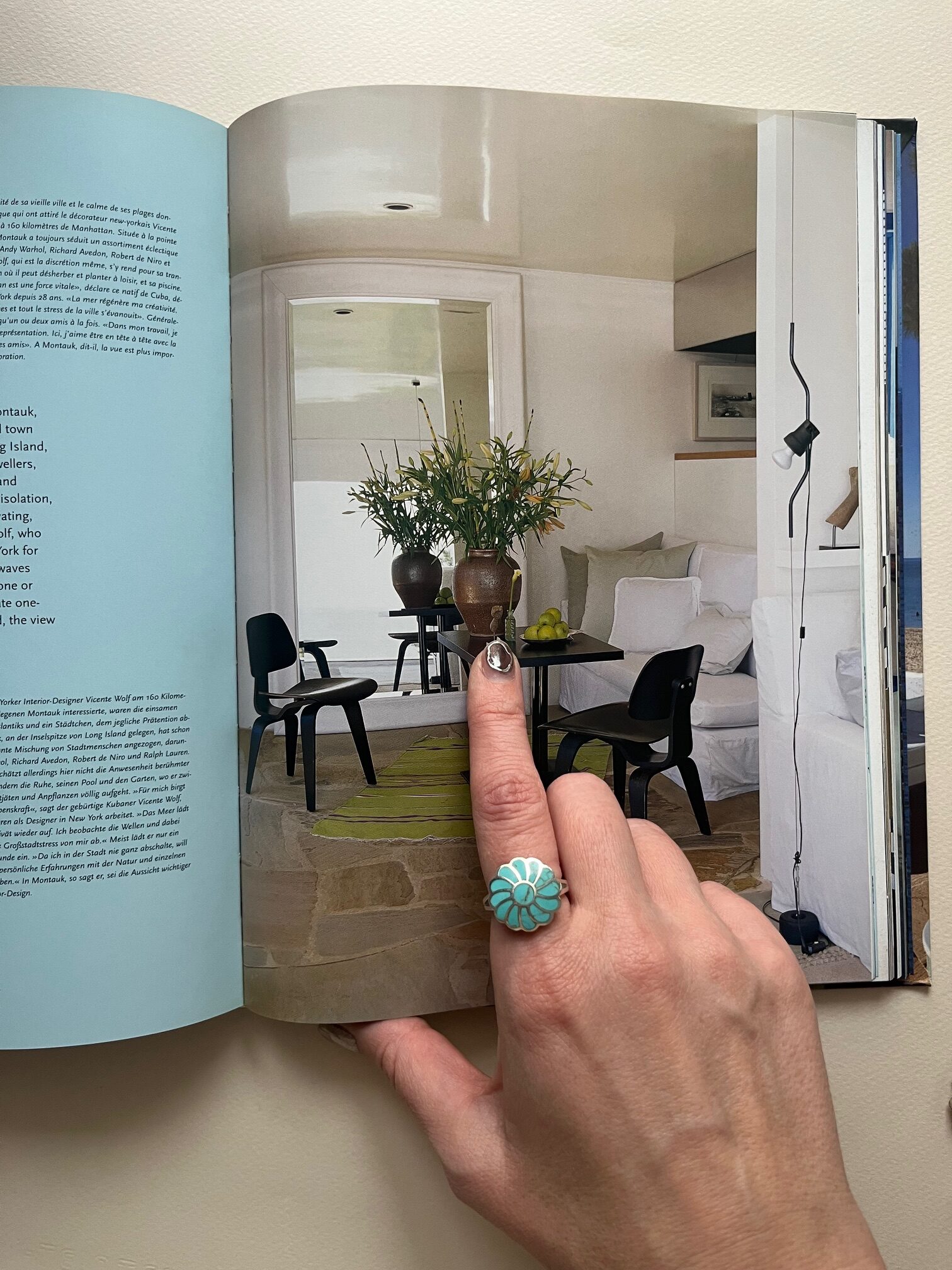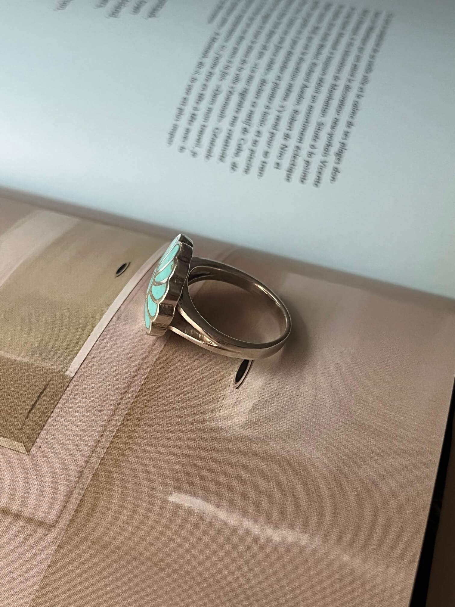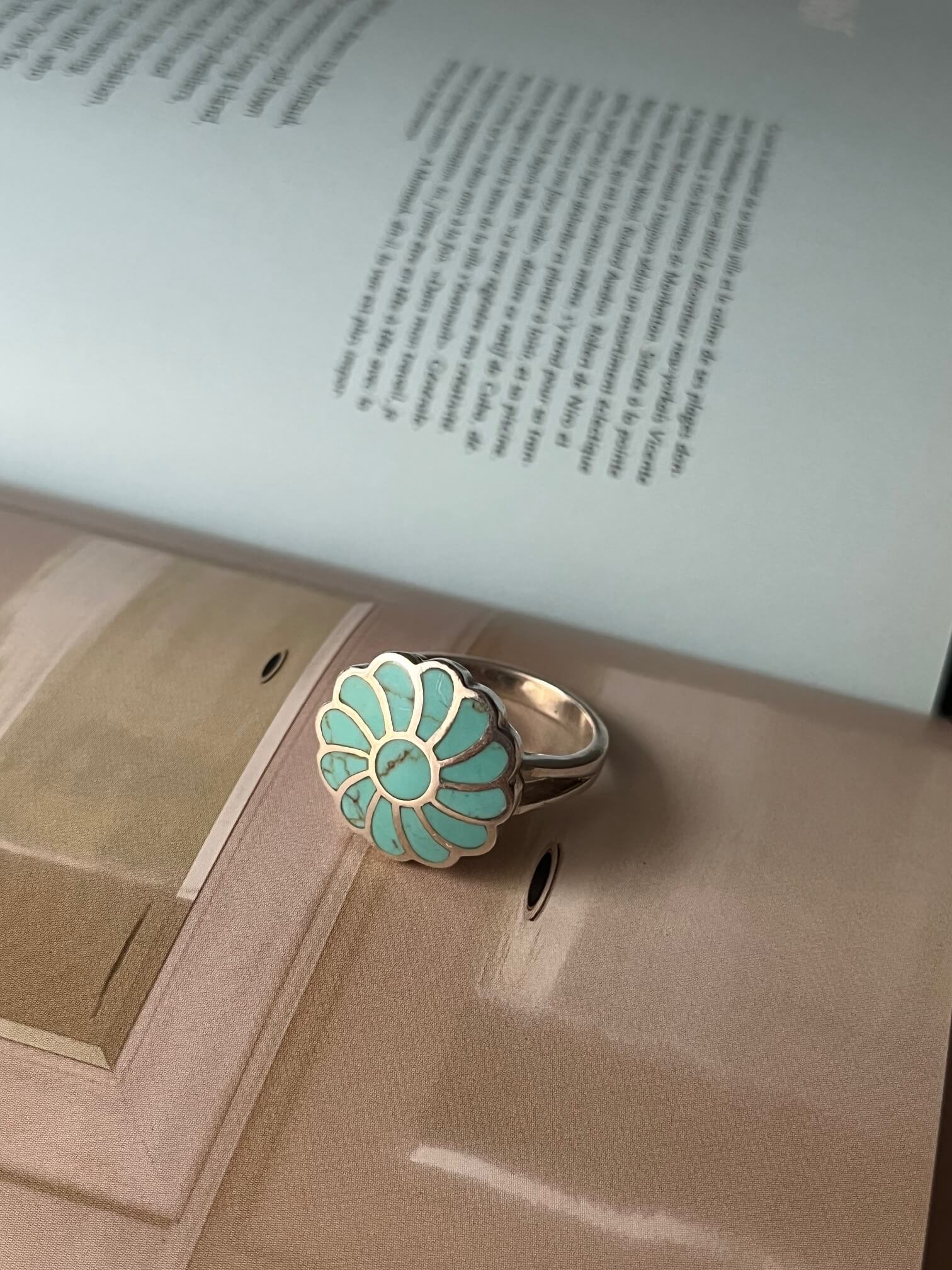 Srebrny pierścionek o botanicznej formie z zatopionymi elementami z naturalnego turkusu.