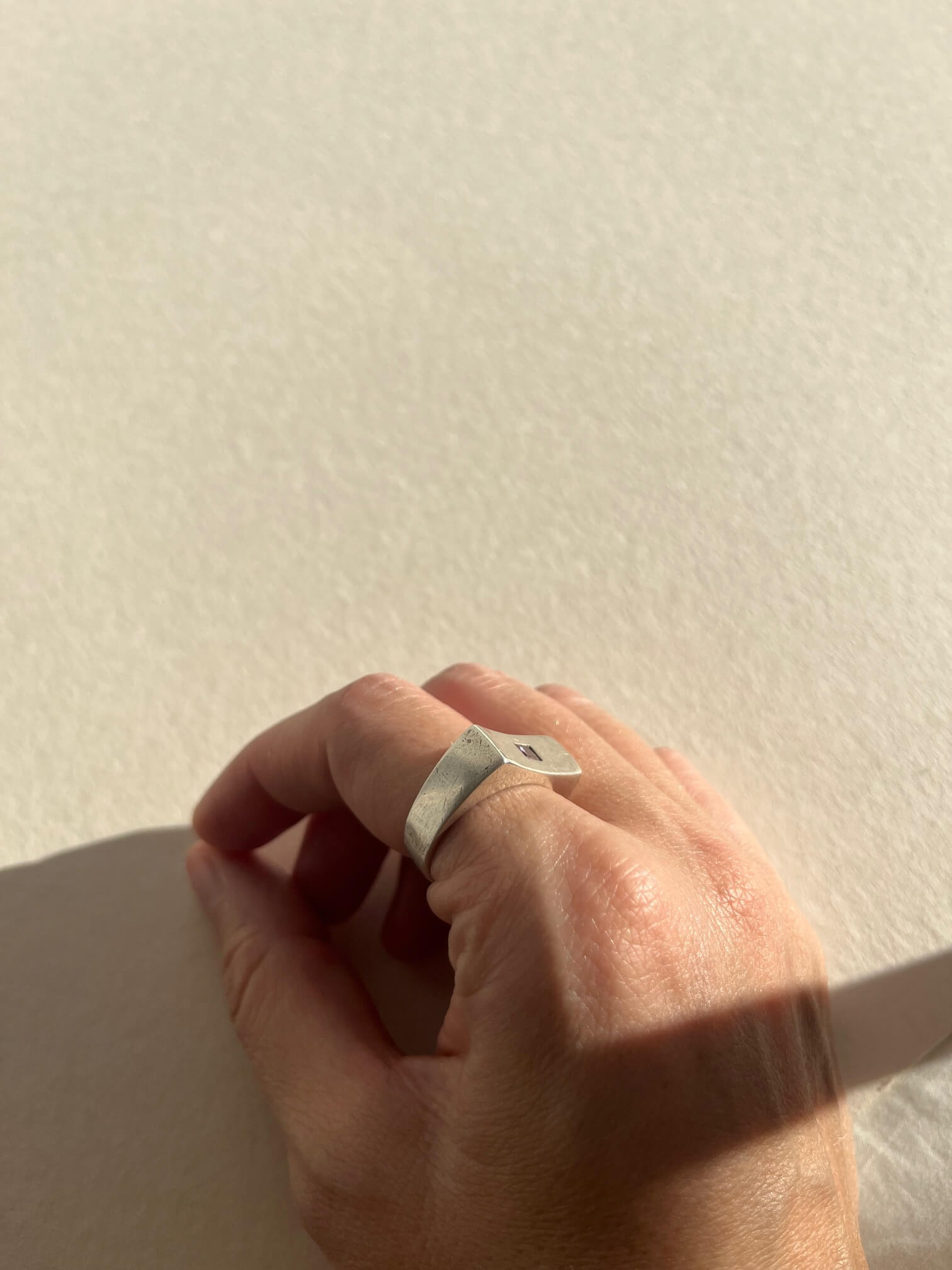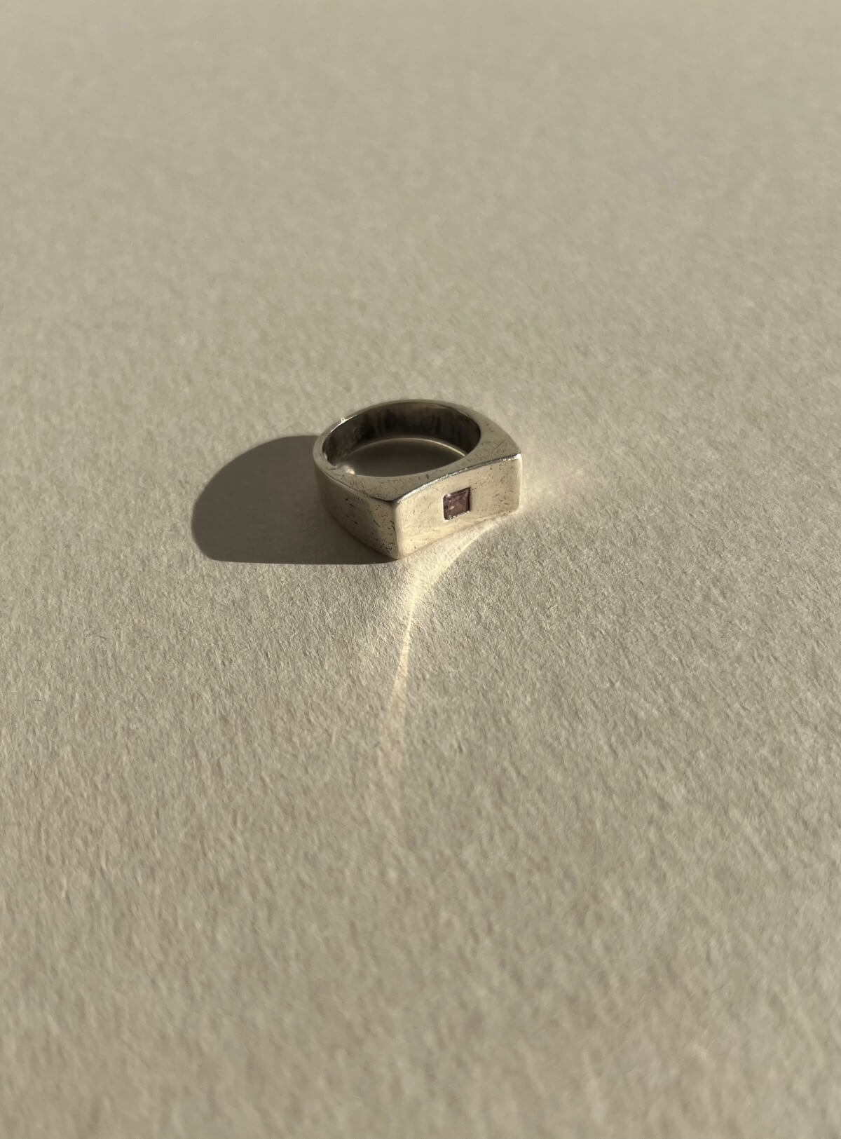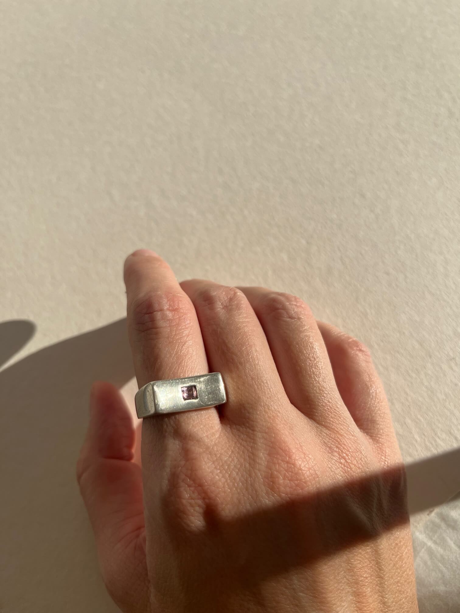 Geometryczny sygnet ze srebra z uroczym różowym kryształkiem.